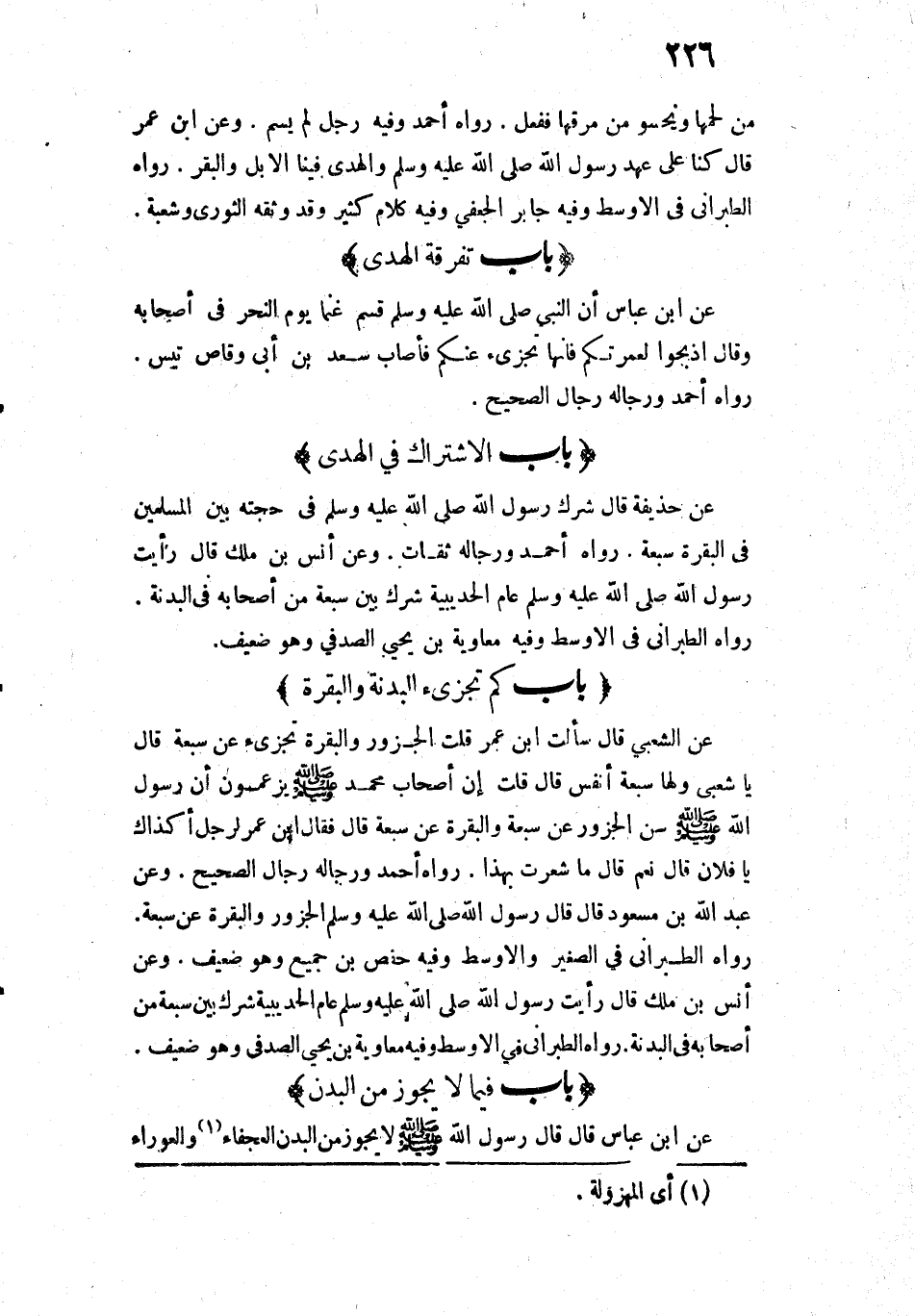 5386 - «وَعَنِ ابْنِ عُمَرَ قَالَ: كُنَّا عَلَى عَهْدِ رَسُولِ اللَّهِ صَلَّى اللَّهُ عَلَيْهِ وَسَلَّمَ وَالْهَدْيُ فِينَا الْإِبِلُ وَالْبَقَرُ».