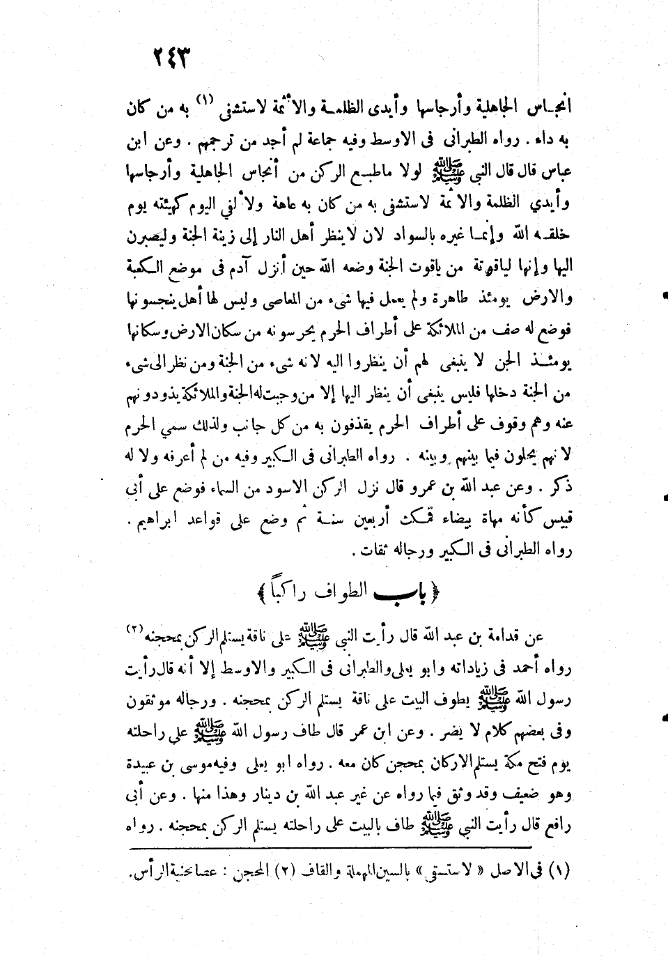 رَوَاهُ أَحْمَدُ وَأَبُو يَعْلَى، وَالطَّبَرَانِيُّ فِي الْكَبِيرِ وَالْأَوْسَطِ ; إِلَّا أَنَّهُ قَالَ: «رَأَيْتُ رَسُولَ اللَّهِ صَلَّى اللَّهُ عَلَيْهِ وَسَلَّمَ يَطُوفُ الْبَيْتَ عَلَى نَاقَةٍ يَسْتَلِمُ الرُّكْنَ بِمِحْجَنِهِ». وَرِجَالُهُ مُوَثَّقُونَ، وَفِي بَعْضِهِمْ كَلَامٌ لَا يَضُرُّ.