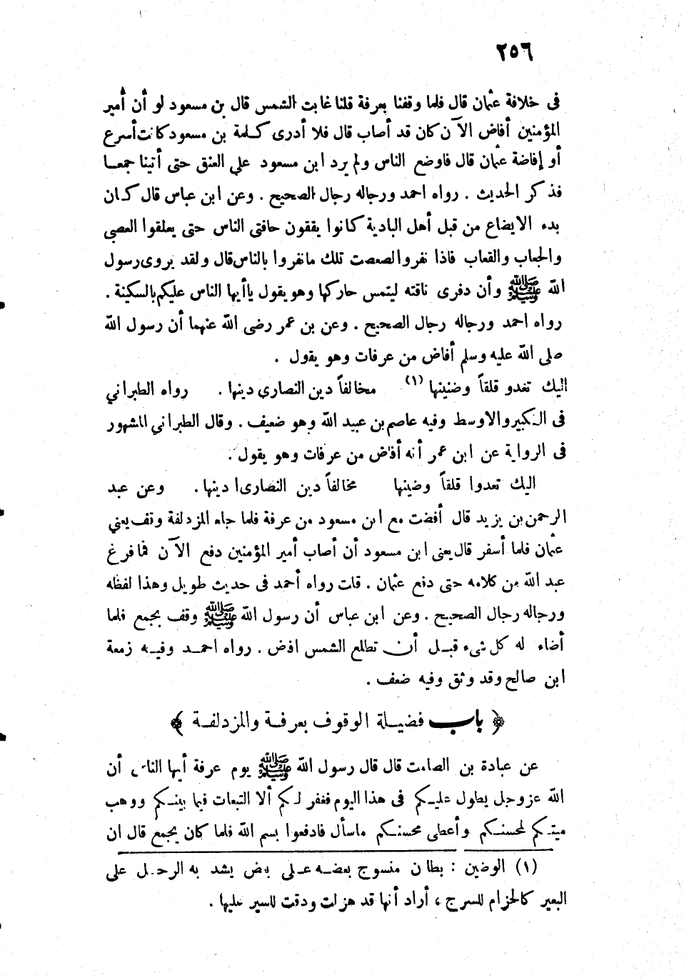 فِي خِلَافَةِ عُثْمَانَ. قَالَ: فَلَمَّا وَقَفْنَا بِعَرَفَةَ قُلْنَا: غَابَتِ الشَّمْسُ؟ قَالَ ابْنُ مَسْعُودٍ: لَوْ أَنَّ أَمِيرَ الْمُؤْمِنِينَ أَفَاضَ الْآنَ كَانَ قَدْ أَصَابَ. قَالَ: فَلَا أَدْرِي كَلِمَةُ ابْنِ مَسْعُودٍ كَانَتْ أَسْرَعَ أَوْ إِفَاضَةُ عُثْمَانَ؟ قَالَ: فَأَوْضَعَ النَّاسُ، وَلَمْ يَرِدِ ابْنُ مَسْعُودٍ عَلَى الْعَنَقِ، حَتَّى أَتَيْنَا جَمْعًا - فَذَكَرَ الْحَدِيثَ.