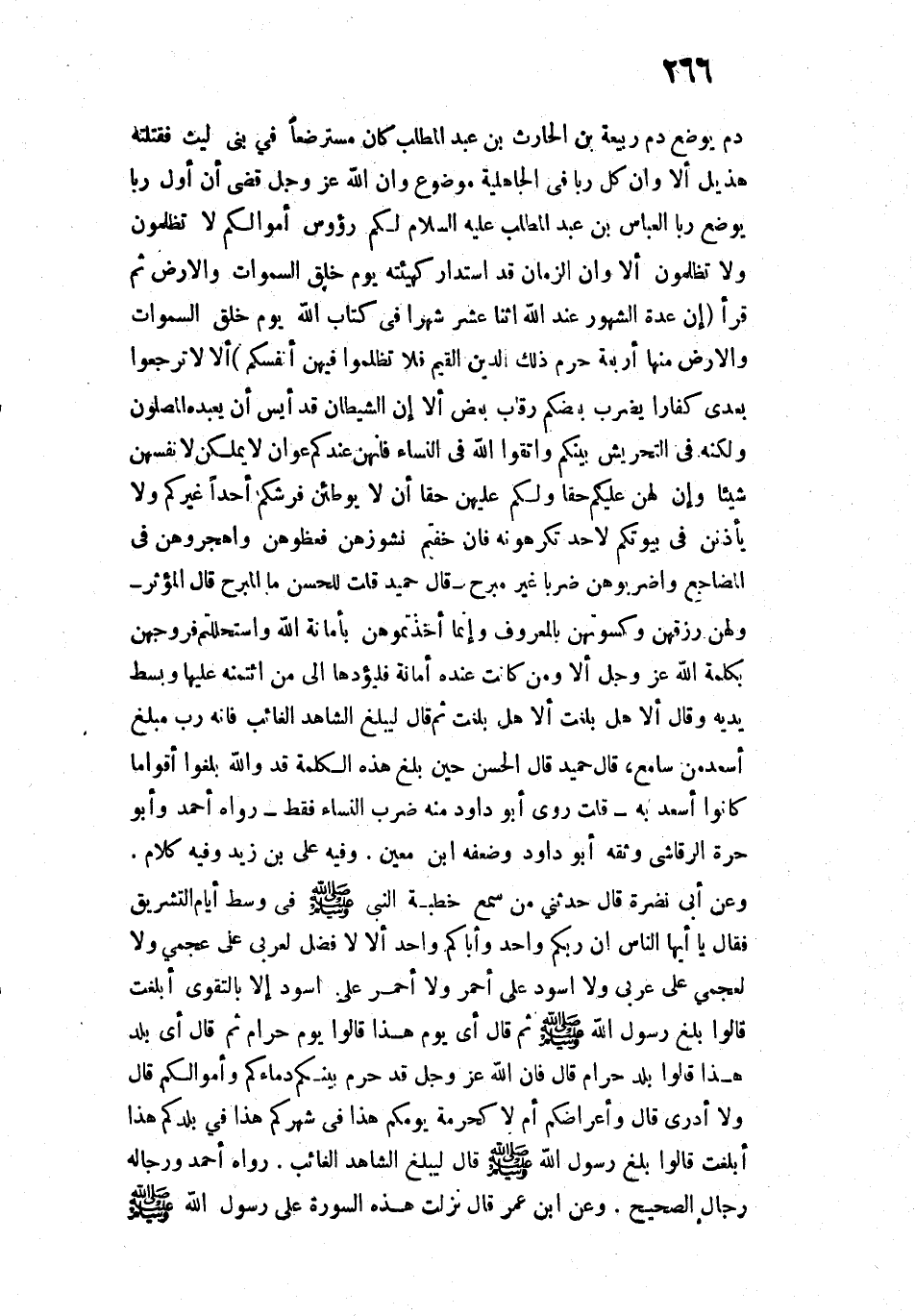 دَمٍ يُوضَعُ دَمُ رَبِيعَةَ بْنِ الْحَارِثِ بْنِ عَبْدِ الْمُطَّلِبِ كَانَ مُسْتَرْضَعًا فِي بَنِي لَيْثٍ فَقَتَلَتْهُ هُذَيْلٌ أَلَا وَإِنَّ كُلَّ رِبًا فِي الْجَاهِلِيَّةِ مَوْضُوعٌ، وَإِنَّ اللَّهَ عَزَّ وَجَلَّ قَضَى أَنَّ أَوَّلَ رِبًا يُوضَعُ رِبَا الْعَبَّاسِ بْنِ عَبْدِ الْمُطَّلِبِ عَلَيْهِ السَّلَامُ لَكُمْ رُءُوسُ أَمْوَالِكُمْ لَا تَظْلِمُونَ وَلَا تُظْلَمُونَ أَلَا وَإِنَّ الزَّمَانَ قَدِ اسْتَدَارَ كَهَيْئَتِهِ يَوْمَ خَلَقَ اللَّهُ السَّمَاوَاتِ وَالْأَرْضَ، ثُمَّ قَرَأَ: (إِنَّ عِدَّةَ الشُّهُورِ عِنْدَ اللَّهِ اثْنَا عَشَرَ شَهْرًا فِي كِتَابِ اللَّهِ يَوْمَ خَلَقَ السَّمَاوَاتِ وَالْأَرْضَ مِنْهَا أَرْبَعَةٌ حُرُمٌ ذَلِكَ الدِّينُ الْقَيِّمُ فَلَا تَظْلِمُوا فِيهِنَّ أَنْفُسَكُمْ) أَلَا لَا تَرْجِعُوا بَعْدِي كُفَّارًا يَضْرِبُ بَعْضُكُمْ رِقَابَ بَعْضٍ أَلَا إِنَّ الشَّيْطَانَ قَدْ أَيِسَ أَنْ يَعْبُدَهُ الْمُصَلُّونَ، وَلَكِنَّهُ فِي التَّحْرِيشِ بَيْنَكُمْ وَاتَّقُوا اللَّهَ فِي النِّسَاءِ، فَإِنَّهُنَّ عِنْدَكُمْ عَوَانٌ لَا يَمْلِكْنَ لِأَنْفُسِهِنَّ شَيْئًا، وَإِنَّ لَهُنَّ عَلَيْكُمْ حَقًّا، وَلَكُمْ عَلَيْهِنَّ حَقًّا: أَنْ لَا يُوطِئْنَ فُرُشَكُمْ أَحَدًا غَيْرَكُمْ، وَلَا يَأْذَنُنَّ فِي بُيُوتِكُمْ لِأَحَدٍ تَكْرَهُونَهُ، فَإِنْ خِفْتُمْ نُشُوزَهُنَّ فَعِظُوهُنَّ وَاهْجُرُوهُنَّ فِي الْمَضَاجِعِ، وَاضْرِبُوهُنَّ ضَرْبًا غَيْرَ مُبَرِّحٍ " - قَالَ حُمَيْدٌ: قُلْتُ لِلْحَسَنِ: مَا الْمُبَرِّحُ؟ قَالَ: الْمُؤَثِّرُ - " (وَلَهُنَّ رِزْقُهُنَّ وَكِسْوَتُهُنَّ بِالْمَعْرُوفِ)، وَإِنَّمَا أَخَذْتُمُوهُنَّ بِأَمَانَةِ اللَّهِ، وَاسْتَحْلَلْتُمْ فُرُوجَهُنَّ بِكَلِمَةِ اللَّهِ عَزَّ وَجَلَّ، أَلَا وَمَنْ كَانَتْ عِنْدَهُ أَمَانَةٌ فَلْيُؤَدِّهَا إِلَى مَنِ ائْتَمَنَهُ عَلَيْهَا ". وَبَسَطَ يَدَيْهِ وَقَالَ: " أَلَا هَلْ بَلَّغْتُ؟ أَلَا هَلْ بَلَّغْتُ؟ ". ثُمَّ قَالَ: " لِيُبَلِّغِ الشَّاهِدُ الْغَائِبَ ; فَإِنَّهُ رُبَّ مُبَلَّغٍ أَسْعَدُ مِنْ سَامِعٍ». قَالَ حُمَيْدٌ: قَالَ الْحَسَنُ حِينَ بَلَغَ هَذِهِ الْكَلِمَةَ: قَدْ وَاللَّهِ بَلَّغُوا أَقْوَامًا كَانُوا أَسْعَدَ بِهِ.