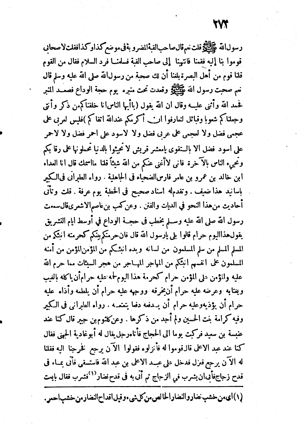 رَسُولِ اللَّهِ صَلَّى اللَّهُ عَلَيْهِ وَسَلَّمَ؟ قُلْتُ: نَعَمْ. قَالَ: صَاحِبُ الْقُبَّةِ الْمَضْرُوبَةِ فِي مَوْضِعِ كَذَا وَكَذَا. فَقُلْتُ لِأَصْحَابِي: قُومُوا بِنَا إِلَيْهِ. فَقُمْنَا فَانْتَهَيْنَا إِلَى صَاحِبِ الْقُبَّةِ، فَسَلَّمْنَا فَرَدَّ السَّلَامَ فَقَالَ: مَنِ الْقَوْمُ؟ قُلْنَا: قَوْمٌ مِنْ أَهْلِ الْبَصْرَةِ، بَلَغَنَا أَنَّ لَكَ صُحْبَةً مِنْ رَسُولِ اللَّهِ صَلَّى اللَّهُ عَلَيْهِ وَسَلَّمَ؟ قَالَ: نَعَمْ صَحِبْتُ رَسُولَ اللَّهِ صَلَّى اللَّهُ عَلَيْهِ وَسَلَّمَ وَقَعَدْتُ تَحْتَ مِنْبَرِهِ يَوْمَ حَجَّةِ الْوَدَاعِ فَصَعِدَ الْمِنْبَرَ فَحَمِدَ اللَّهَ وَأَثْنَى عَلَيْهِ وَقَالَ: " «إِنَّ اللَّهَ يَقُولُ " يَا أَيُّهَا النَّاسُ إِنَّا خَلَقْنَاكُمْ مِنْ ذَكَرٍ وَأُنْثَى وَجَعَلْنَاكُمْ شُعُوبًا وَقَبَائِلَ لِتَعَارَفُوا إِنَّ أَكْرَمَكُمْ عِنْدَ اللَّهِ أَتْقَاكُمْ فَلَيْسَ لِعَرَبِيٍّ عَلَى عَجَمِيٍّ فَضْلٌ، وَلَا لِعَجَمِيِّ عَلَى عَرَبِيٍّ فَضْلٌ، وَلَا لِأَسْوَدَ عَلَى أَبْيَضَ فَضْلٌ، وَلَا لِأَبْيَضَ عَلَى أَسْوَدَ فَضْلٌ، إِلَّا بِالتَّقْوَى. يَا مَعْشَرَ قُرَيْشٍ لَا تَجِيئُوا بِالدُّنْيَا تَحْمِلُونَهَا عَلَى رِقَابِكُمْ وَتَجِيءُ النَّاسُ بِالْآخِرَةِ فَإِنِّي لَا أُغْنِي عَنْكُمْ مِنَ اللَّهِ شَيْئًا». قُلْنَا: مَا اسْمُكَ؟ قَالَ: أَنَا الْعَدَّاءُ بْنُ خَالِدِ بْنِ عَمْرِو بْنِ عَامِرٍ فَارِسُ الضَّحْيَاءِ فِي الْجَاهِلِيَّةِ.