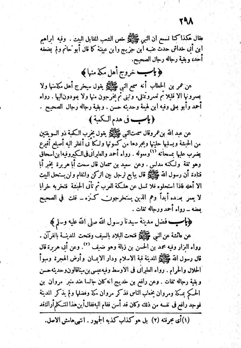 5778 - «وَعَنْ رَافِعِ بْنِ خَدِيجٍ أَنَّهُ كَانَ جَالِسًا عِنْدَ مِنْبَرِ مَرْوَانَ بْنِ الْحَكَمِ بِمَكَّةَ، وَمَرْوَانُ يَخْطُبُ النَّاسَ فَذَكَرَ مَرْوَانُ مَكَّةَ وَفَضْلَهَا، وَلَمْ يَذْكُرِ الْمَدِينَةَ، فَوَجَدَ رَافِعُ فِي نَفْسِهِ مِنْ ذَلِكَ، وَكَانَ قَدْ أَسَنَّ فَقَامَ إِلَيْهِ فَقَالَ: أَيْنَ هَذَا الْمُتَكَلِّمُ؟ أَرَاكَ قَدْ