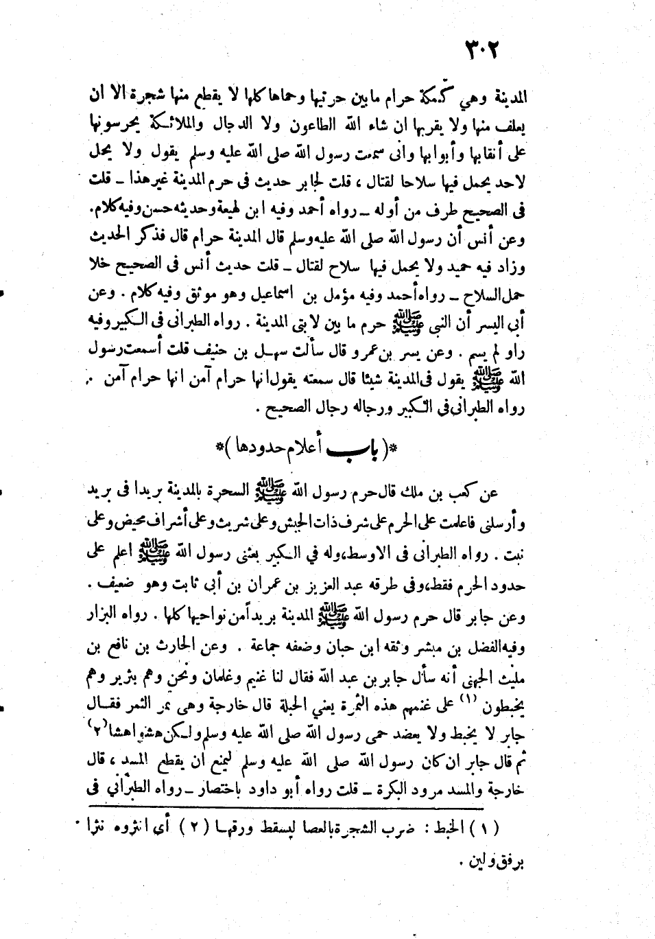 الْمَدِينَةَ، وَهِيَ كَمَكَّةَ حَرَامٌ مَا بَيْنَ حَرَّتَيْهَا، وَحِمَاهَا كُلِّهَا لَا يُقْطَعُ مِنْهَا شَجَرَةٌ إِلَّا أَنْ يُعْلَفَ [رَجُلٌ] مِنْهَا، وَلَا يَقْرَبُهَا إِنْ شَاءَ اللَّهُ الطَّاعُونُ وَلَا الدَّجَّالُ، وَالْمَلَائِكَةُ يَحْرُسُونَهَا عَلَى أَنْقَابِهَا وَأَبْوَابِهَا» ".