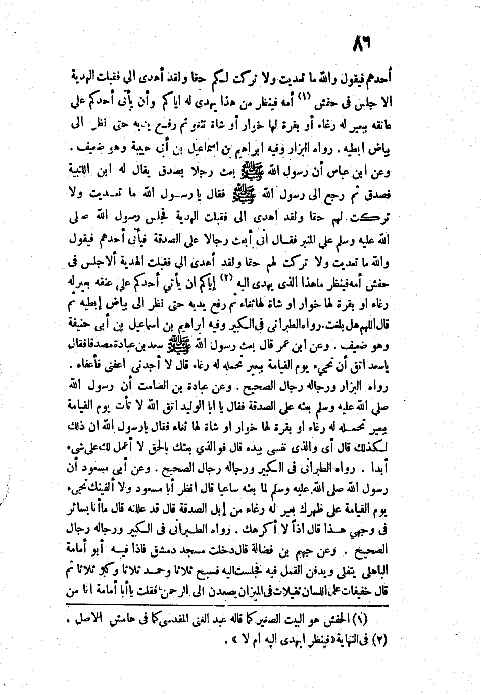 أَحَدُهُمْ، فَيَقُولُ: وَاللَّهِ مَا تَعَدَّيْتُ وَلَا تَرَكْتُ لَكُمْ حَقًّا، وَلَقَدْ أُهْدِيَ إِلَيَّ فَقَبِلْتُ الْهَدِيَّةَ إِلَّا جَلَسَ فِي حِفْشِ أُمِّهِ، فَيَنْظُرُ مَنْ هَذَا الَّذِي يُهْدِي لَهُ، إِيَّاكُمْ وَأَنْ يَأْتِيَ أَحَدُكُمْ عَلَى عَاتِقِهِ بِبَعِيرٍ لَهُ رُغَاءٌ، أَوْ بَقَرَةٍ لَهَا خُوَارٌ، أَوْ شَاةٍ تَثْغُو ". ثُمَّ رَفَعَ يَدَيْهِ حَتَّى نُظِرَ إِلَى بَيَاضِ إِبِطَيْهِ».