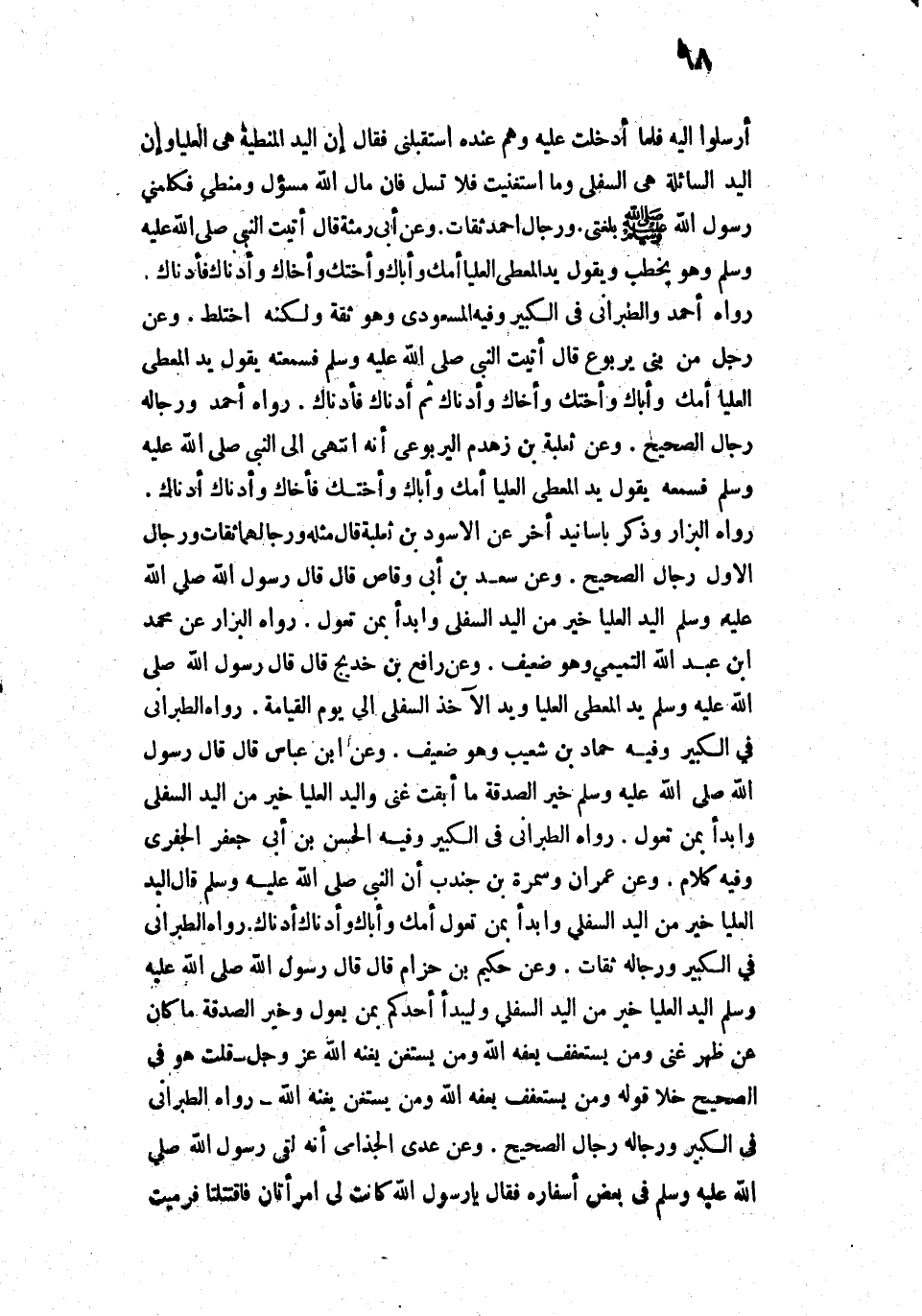 " أَرْسِلُوا إِلَيْهِ ". فَلَمَّا أُدْخِلْتُ عَلَيْهِ وَهُمْ عِنْدَهُ اسْتَقْبَلَنِي، فَقَالَ: " إِنَّ الْيَدَ الْمُنْطِيَةَ هِيَ الْعُلْيَا، وَإِنَّ الْيَدَ السَّائِلَةَ هِيَ السُّفْلَى، وَمَا اسْتَغْنَيْتَ فَلَا تَسَلْ، فَإِنَّ مَالَ اللَّهِ مَسْئُولٌ وَمُنْطًى ". فَكَلَّمَنِي رَسُولُ اللَّهِ صَلَّى اللَّهُ عَلَيْهِ وَسَلَّمَ بُلْغَتِي»، وَرِجَالُ أَحْمَدَ ثِقَاتٌ.