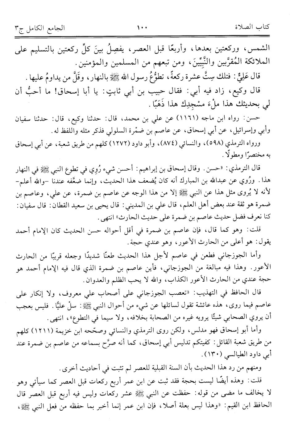 وأما أبو إسحاق فهو مدلس، ولكن روى الترمذي والنسائي وصحّحه ابن خزيمة (١٢١١) كلهم من طريق شعبة القائل: كفيتكم تدليس أبي إسحاق، كما أنه صرَّح بسماعه من عاصم بن ضمرة عند أبي داود الطيالسي (١٣٠).
