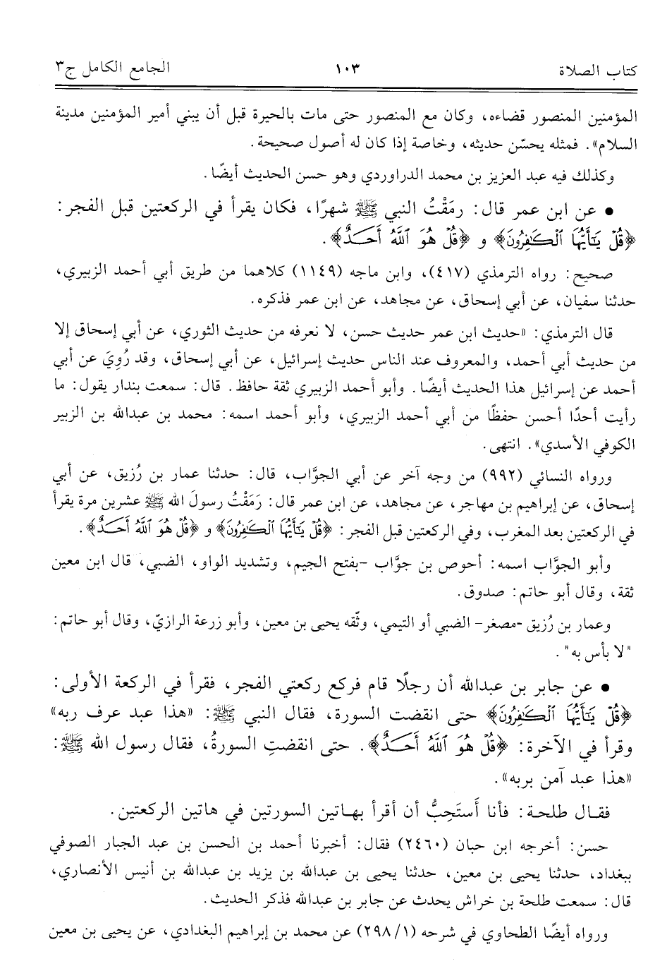 ورواه النسائي (٩٩٢) من وجه آخر عن أبي الجوَّاب، قال: حدثنا عمار بن رُزيق، عن أبي إسحاق، عن إبراهيم بن مهاجر، عن مجاهد، عن ابن عمر قال: رَمَقْتُ رسول الله صلى الله عليه وسلم عشرين مرة يقرأ في الركعتين بعد المغرب، وفي الركعتين قبل الفجر: {قُلْ يَاأَيُّهَا الْكَافِرُونَ} و {قُلْ هُوَ اللَّهُ أَحَدٌ}.