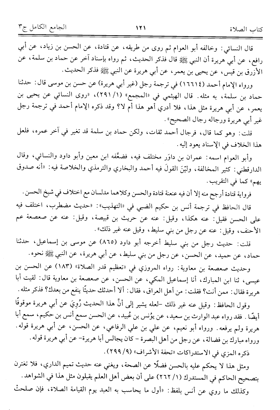 قال النسائي: وخالفه أبو العوام ثم روى من طريقه، عن قتادة، عن الحسن بن زياد، عن أبي رافع، عن أبي هريرة أن النبي - صلى الله عليه وسلم - قال فذكر الحديث، ثم رواه بإسناد آخر عن حماد بن سلمة، عن الأزرق بن قيس، عن يحيى بن يعمر، عن أبي هريرة عن النبي - صلى الله عليه وسلم - فذكر الحديث.