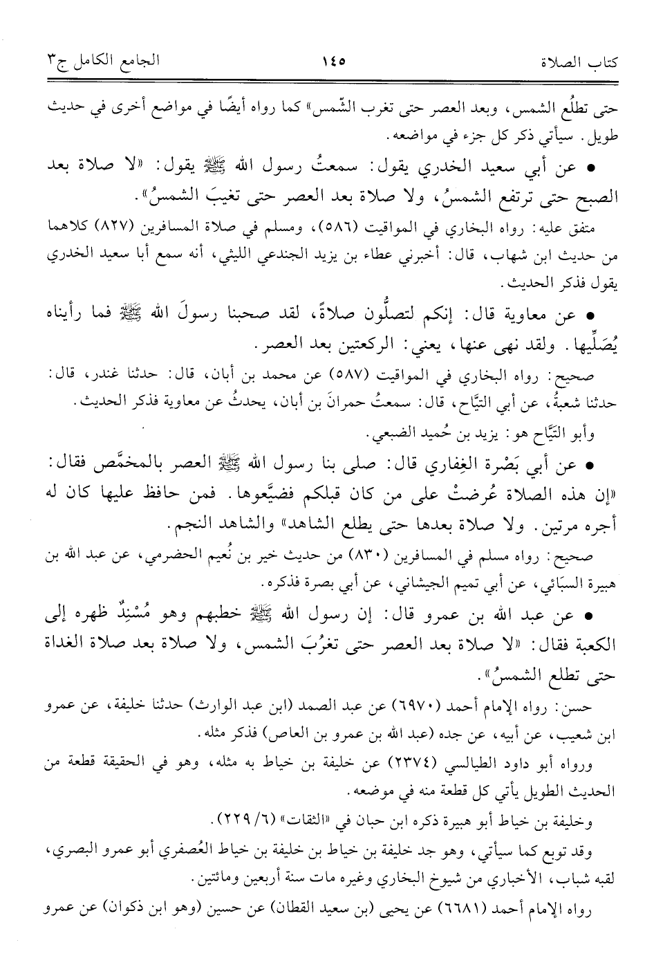 حتى تطلُع الشمس، وبعد العصر حتى تغرب الشمس" كما رواه أيضًا في مواضع أخرى في حديث طويل. سيأتي ذكر كل جزء في مواضعه.