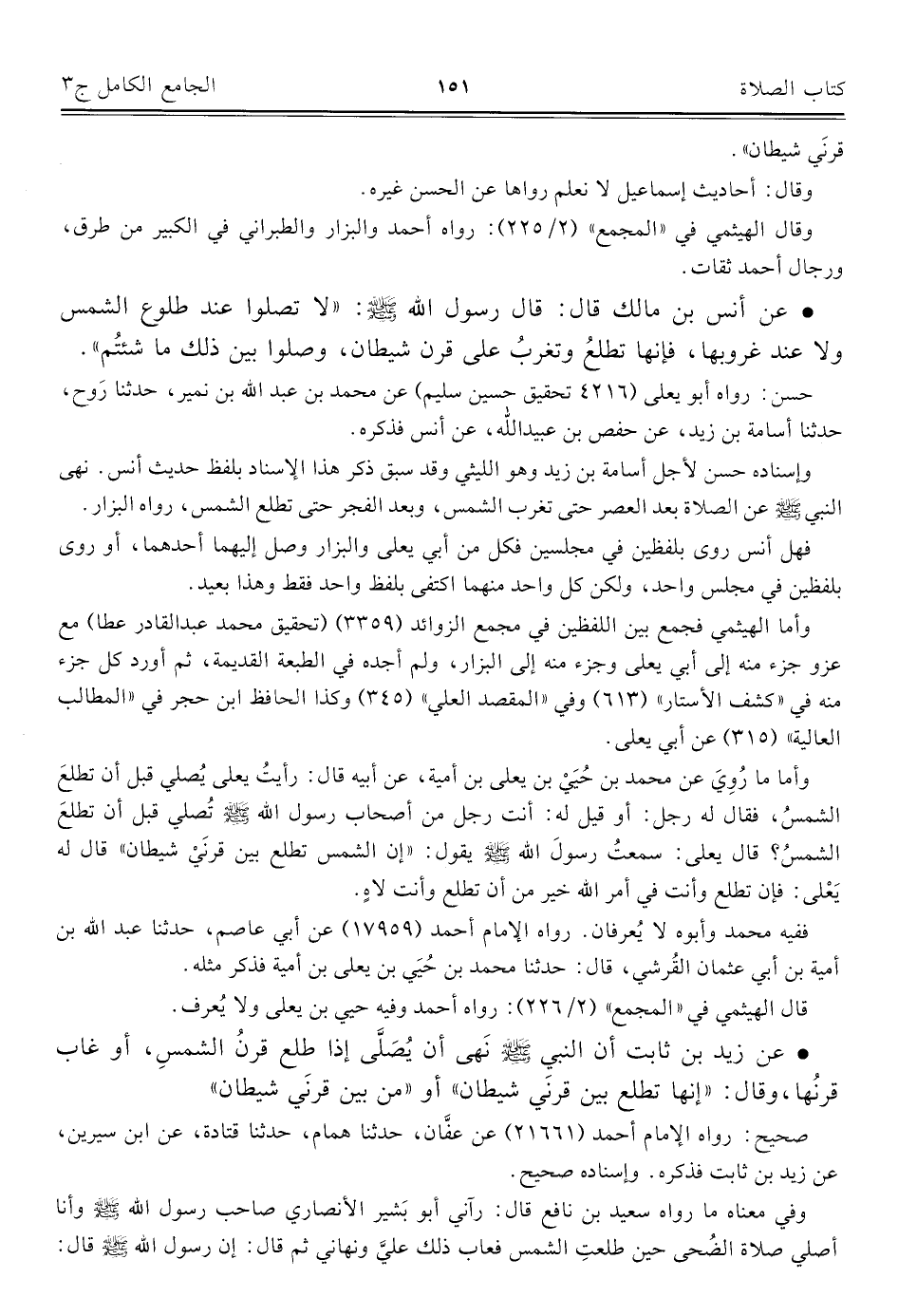 وأما ما رُوِيَ عن محمد بن حُيَي بن يعلى بن أمية، عن أبيه قال: رأيتُ يعلي يُصلي قبل أن تطلعَ الشمسُ، فقال له رجل: أو قيل له: أنت رجل من أصحاب رسول الله - صلى الله عليه وسلم - تُصلي قبل أن تطلعَ الشمسُ؟ قال يعلى: سمعتُ رسولَ الله - صلى الله عليه وسلم - يقول: "إن الشمس تطلع بين قرنَيْ شيطان" قال له يَعْلى: فإن تطلع وأنت في أمر الله خير من أن تطلع وأنت لاهٍ.
