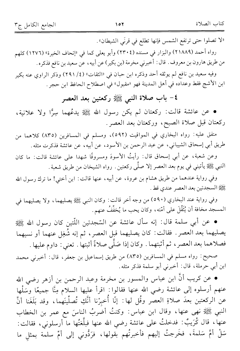 • عن أبي سلمة قال: إنه سأل عائشة عن السجدتين اللتين كان رسول الله - صلى الله عليه وسلم - يصليهما بعد العصر. فقالت: كان يصليهما قبل العصر، ثم إنه شُغِل عنهما أو نسيهما فصلاهما بعد العصر، ثم أثبتهما. وكان إذا صَلَّى صلاةً أثبتها. تعني: داوم عليها.