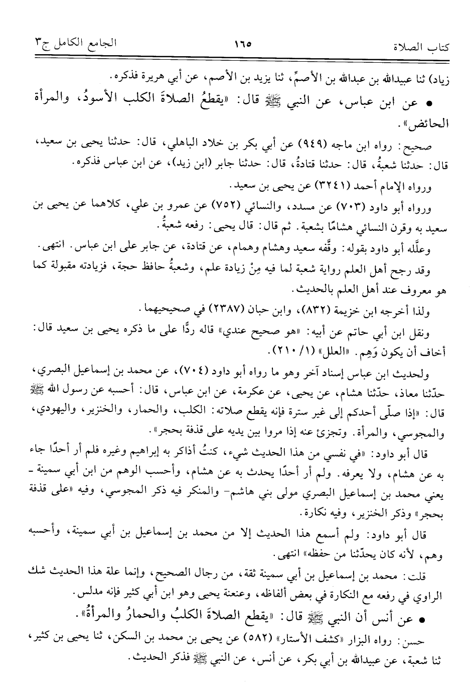 • عن ابن عباس، عن النبي صلى الله عليه وسلم قال: "يقطعُ الصلاةَ الكلب الأسودُ، والمرأة الحائض".
