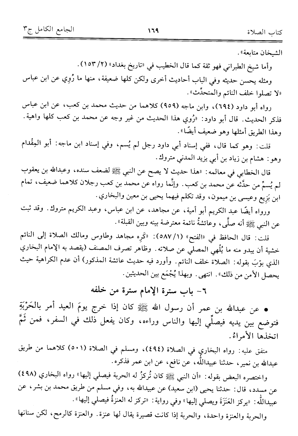 ومثله يحسن حديثه وفي الباب أحاديث أخرى ولكن كلها ضعيفة، منها ما رُوِي عن ابن عباس ولا تصلوا خلف النائم والمتحدِّث".