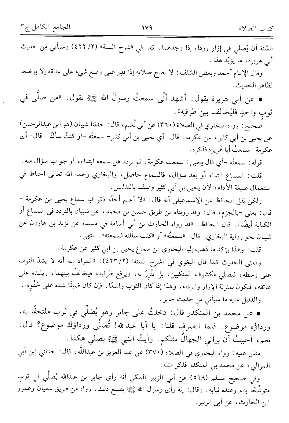 • عن محمد بن المنكدر قال: دخلتُ عليّ جابر وهو يُصَلِّي في ثوب ملتحفًا به، ورداؤه موضوع. فلمّا انصرف قلنا: يا أبا عبد الله! تُصَلِّي ورداؤك موضوع؟ قال: نعم، أحببتُ أن يراني الجهالُ مثلكم. رأيتُ النَّبِيّ - صلى الله عليه وسلم - يصلي هكذا.