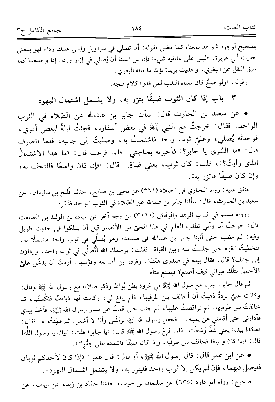 • عن سعيد بن الحارث قال: سألنا جابر بن عبد الله عن الصّلاة في الثوب الواحد. فقال: خرجتُ مع النَّبِيّ - صلى الله عليه وسلم - في بعض أسفاره، فجئتُ ليلةً لبعض أمري، فوجدتُه يُصلي، وعليَّ ثوب واحد فاشتملتُ به، وصليتُ إلى جانبه، فلمّا انصرف قال: "ما السُرى يا جابر؟ " فأخبرته بحاجتي. فلمّا فرغت قال: ما هذا الاشتمالُ الذي رأيتُ؟ "، قلت: كان ثوب، يعني ضاق. قال: فإن كان واسعًا فالتحف به، وإن كان ضيقًا فاتزر به".