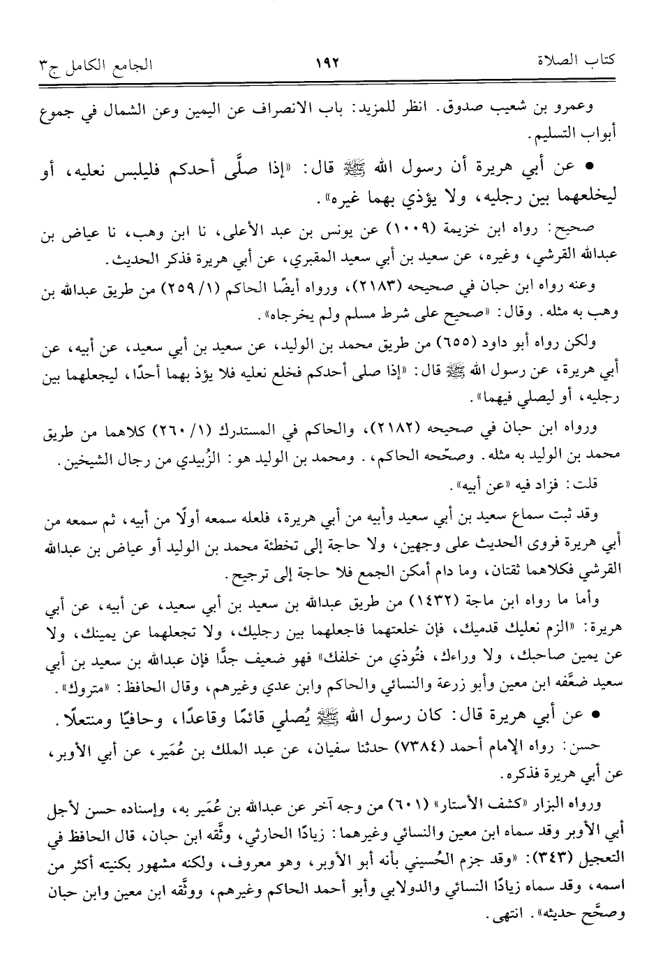 • عن أبي هريرة أن رسول الله صلى الله عليه وسلم قال: "إذا صلَّى أحدكم فليلبس نعليه، أو ليخلعهما بين رجليه، ولا يؤذي بهما غيره".