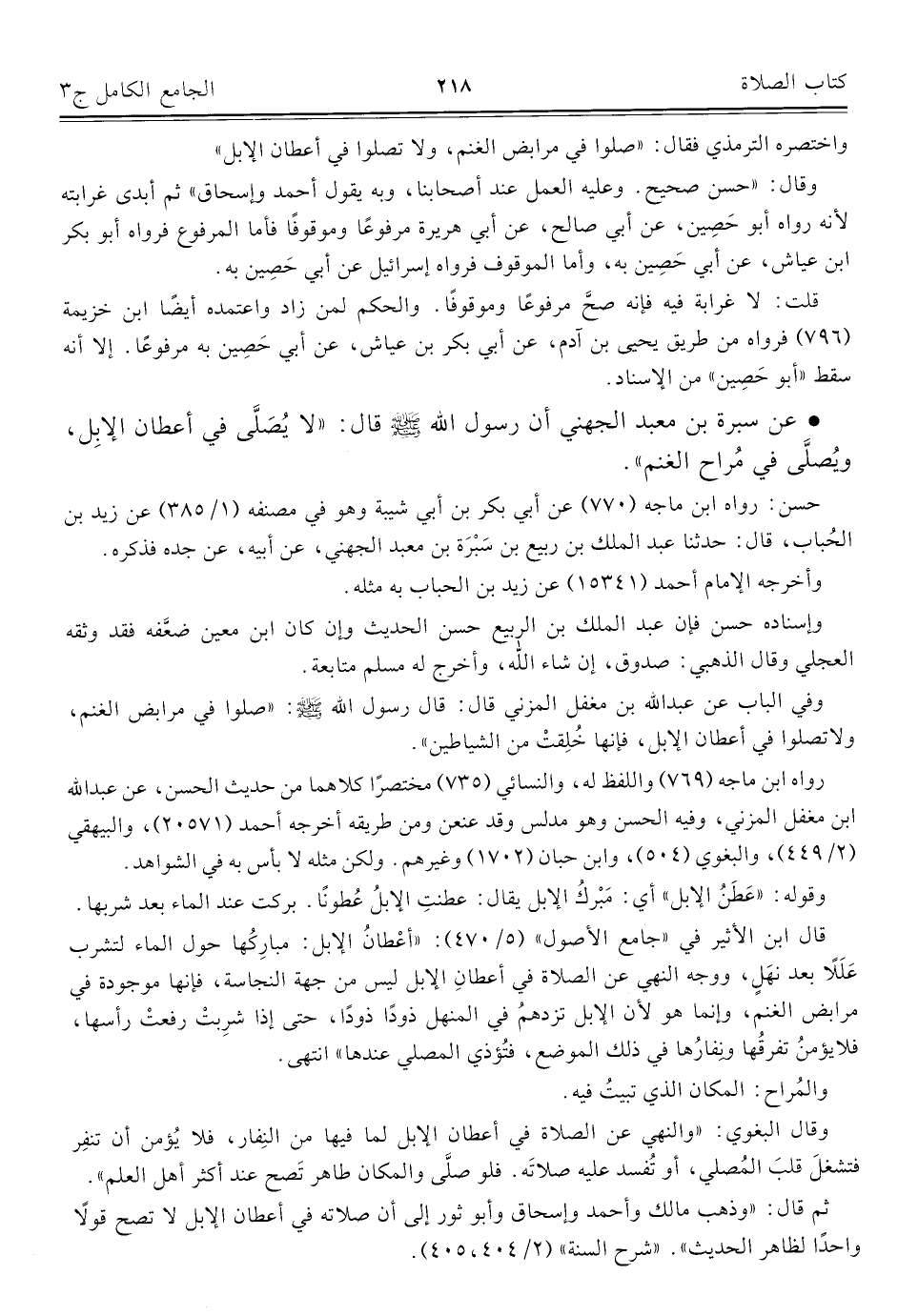 • عن سبرة بن معبد الجهني أن رسول الله صلى الله عليه وسلم قال: "لا يُصَلَّى في أعطان الإبل، ويُصلَّى في مُراح الغنم".