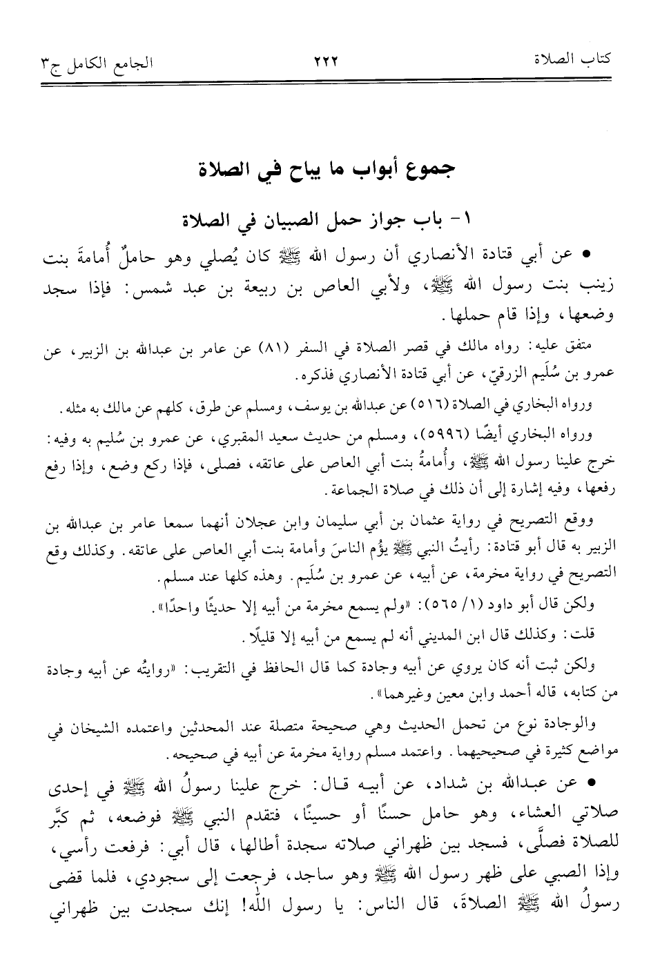 • عن أبي قتادة الأنصاري أن رسول الله - صلى الله عليه وسلم - كان يُصلي وهو حاملٌ أُمامةَ بنت زينب بنت رسول الله - صلى الله عليه وسلم -، ولأبي العاص بن ربيعة بن عبد شمس: فإذا سجد وضعها، وإذا قام حملها.