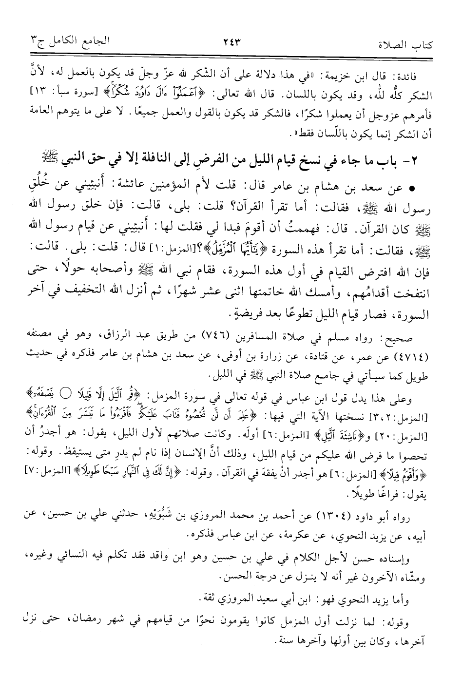 • عن سعد بن هشام بن عامر قال: قلت لأم المؤمنين عائشة: أَنبئِيني عن خُلُقِ رسول الله - صلى الله عليه وسلم -، فقالت: أما تقرأ القرآن؟ قلت: بلى، قالت: فإن خلق رسول الله - صلى الله عليه وسلم - كان القرآن. قال: فهممتُ أن أقومَ فبدا لي فقلت لها: أَنبئِيني عن قيام رسول الله - صلى الله عليه وسلم - فقالت: أما تقرأ هذه السورة {يَاأَيُّهَا الْمُزَّمِّلُ} [المزمل: ١] قال: قلت: بلى. قالت: فإن الله افترض القيام في أول هذه السورة، فقام نبي الله - صلى الله عليه وسلم - وأصحابه حولًا، حتى انتفخت أقدامُهم، وأمسك الله خاتمتها اثني عشر شهرًا، ثم أنزل الله التخفيف في آخر السورة، فصار قيام الليل تطوعًا بعد فريضةٍ.