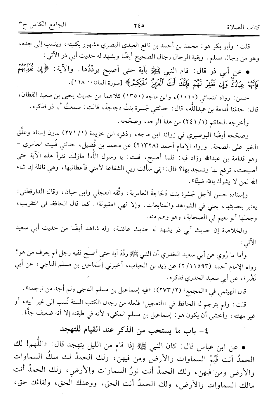 وأما ما رُوي عن أبي سعيد الخدري أن النبي - صلى الله عليه وسلم - ردَّدَ آية حتى أصبح ففيه رجل لم يعرف من هو؟ رواه الإمام أحمد (١١٥٩٣/ ٢) عن زيد بن الحباب، أخبرني إسماعيل بن مسلم الناجي، عن أبي نَضْرة، عن أبي سعيد الخدري فذكره.