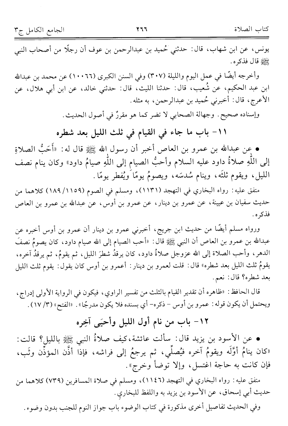 • عن عبد الله بن عمرو بن العاص أخبر أن رسول الله صلى الله عليه وسلم قال له: "أَحَبُّ الصلاةِ إلى اللهِ صلاةُ داود عليه السلام وأحبُ الصيام إلى اللهِ صيامُ داود" وكان ينام نصف الليل، ويقوم ثلثَه، وينام سُدسَه، ويصومُ يومًا ويُفطر يومًا.