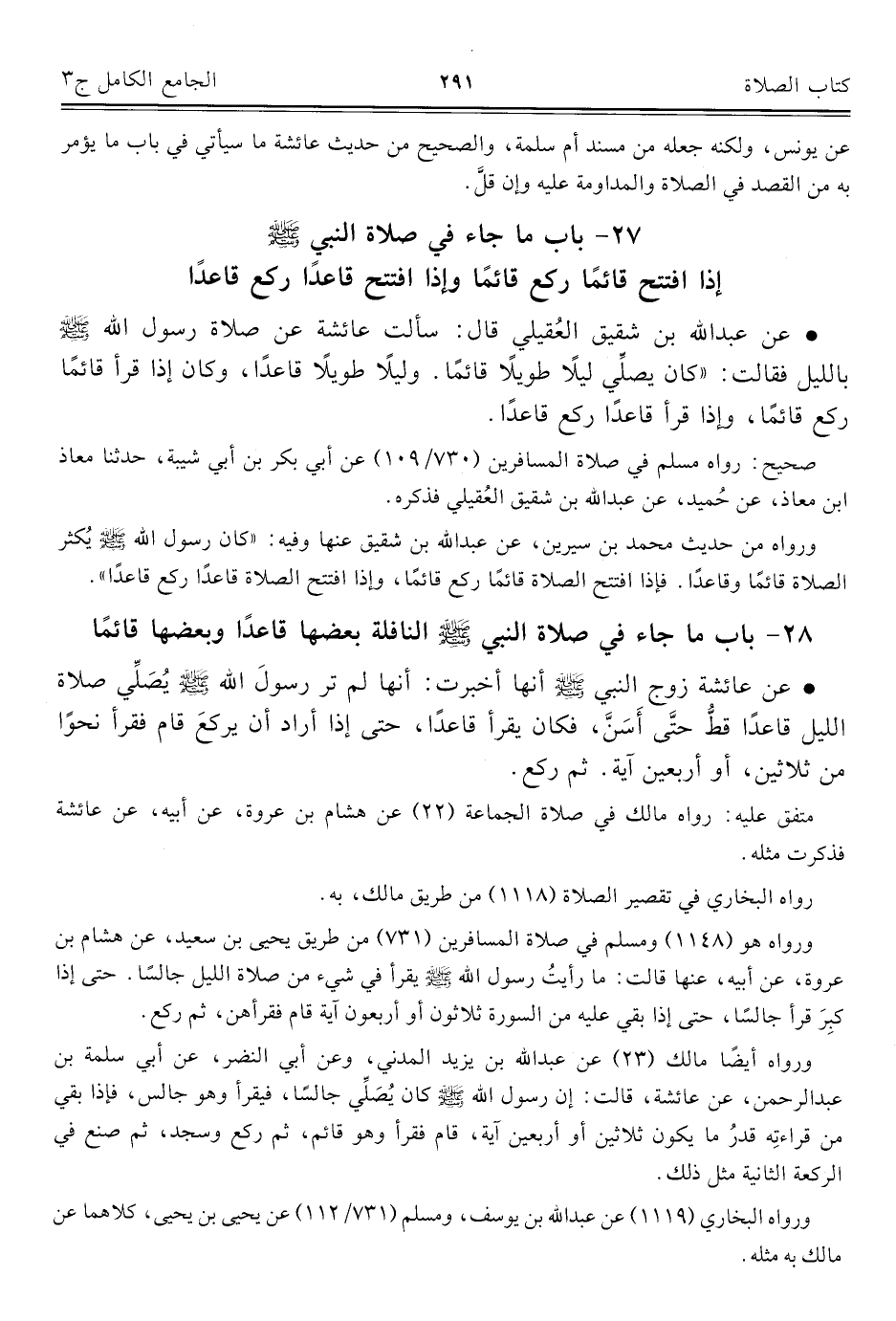 • عن عبد الله بن شقيق العُقيلي قال: سألت عائشة عن صلاة رسول الله صلى الله عليه وسلم بالليل فقالت: "كان يُصَلِّي ليلًا طويلًا قائمًا. وليلًا طويلًا قاعدًا، وكان إذا قرأ قائمًا ركع قائمًا، وإذا قرأ قاعدًا ركع قاعدًا.