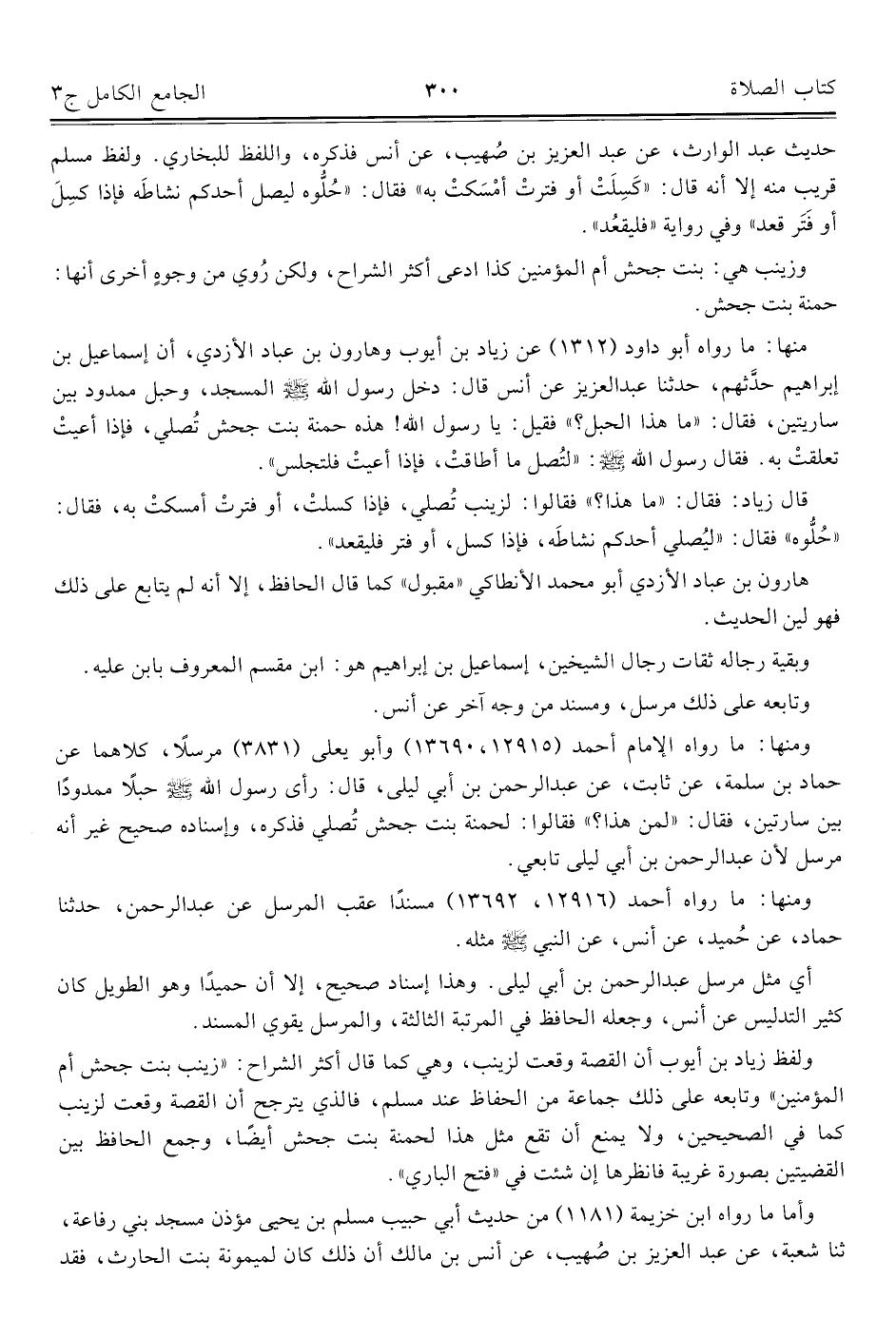 ومنها: ما رواه الإمام أحمد (١٢٩١٥، ١٣٦٩٠) وأبو يعلى (٣٨٣١) مرسلًا، كلاهما عن حمّاد بن سلمة، عن ثابت، عن عبد الرحمن بن أبي ليلى، قال: رأى رسول الله صلى الله عليه وسلم حبلًا ممدودًا بين سارتين، فقال: "لمن هذا؟ " فقالوا: لحمنة بنت جحش تُصلي فذكره، وإسناده صحيح غير أنه مرسل لأن عبد الرحمن بن أبي ليلى تابعي.