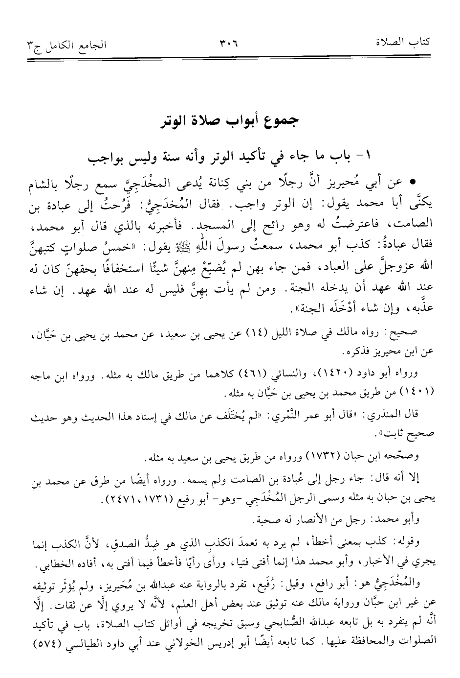 • عن أبي مُحيريز أنَّ رجلًا من بني كِنانة يُدعى المُخْدَجِيَّ سمع رجلًا بالشام يكنَّى أبا محمد يقول: إن الوتر واجب. فقال المُخْدَجِيَّ: فَرُحتُ إلى عبادة بن الصَّامت، فاعترضتُ له وهو رائع إلى المسجد. فأخبرته بالذي قال أبو محمد، فقال عبادةُ: كذب أبو محمد، سمعتُ رسولَ اللهِ - صلى الله عليه وسلم - يقول: "خمسُ صلواتٍ كتبهنَّ الله عَزَّ وَجَلَّ على العباد، فمن جاء بهن لم يُضيّعْ مِنه شيئًا استخفافًا بحقهنّ كان له عند الله عهد أن يدخله الجنّة. ومن لم يأت بهِنَّ فليس له عند الله عهد. إن شاء عذَّبه، وإن شاء أدْخَلَه الجنّة".