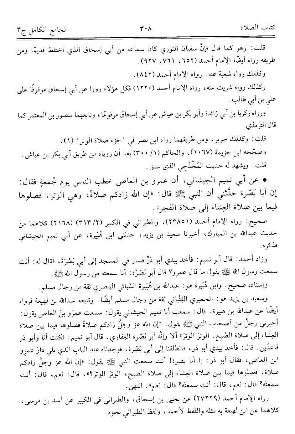 • عن أبي تميم الجيشانيّ، أن عمرو بن العاص خطب الناس يوم جُمعةٍ فقال: إن أبا بَصْرة حَدَّثَنِي أن النَّبِيّ صلى الله عليه وسلم قال: "إنَّ الله زادكم صلاةً، وهي الوتر، فصلوها فيما بين صلاة العِشاء إلى صلاة الفجر".