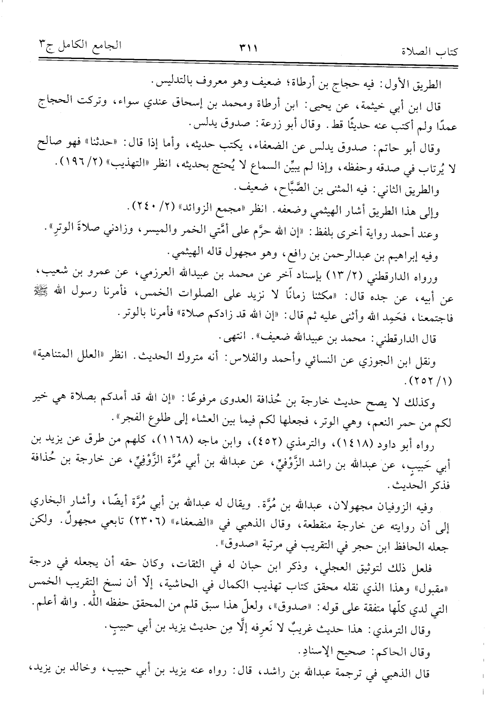وكذلك لا يصح حديث خارجة بن حُذافة العدوى مرفوعًا: "إنَّ الله قد أمدكم بصلاة هي خير لكم من حمر النعم، وهي الوتر، فجعلها لكم فيما بين العشاء إلى طلوع الفجر".