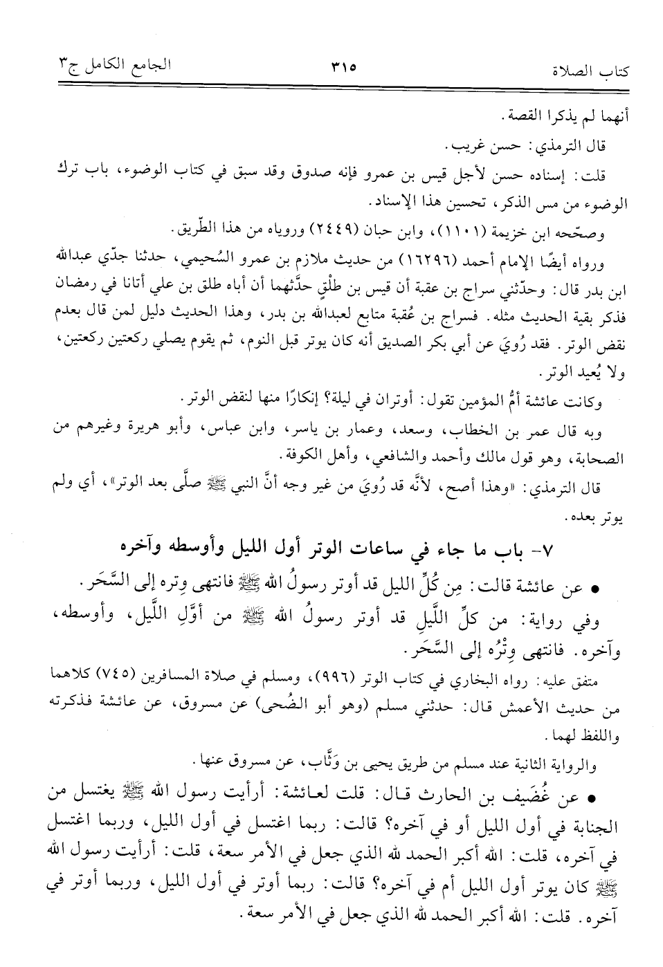 ٧ - باب ما جاء في ساعات الوتر أول الليل وأوسطه وآخره