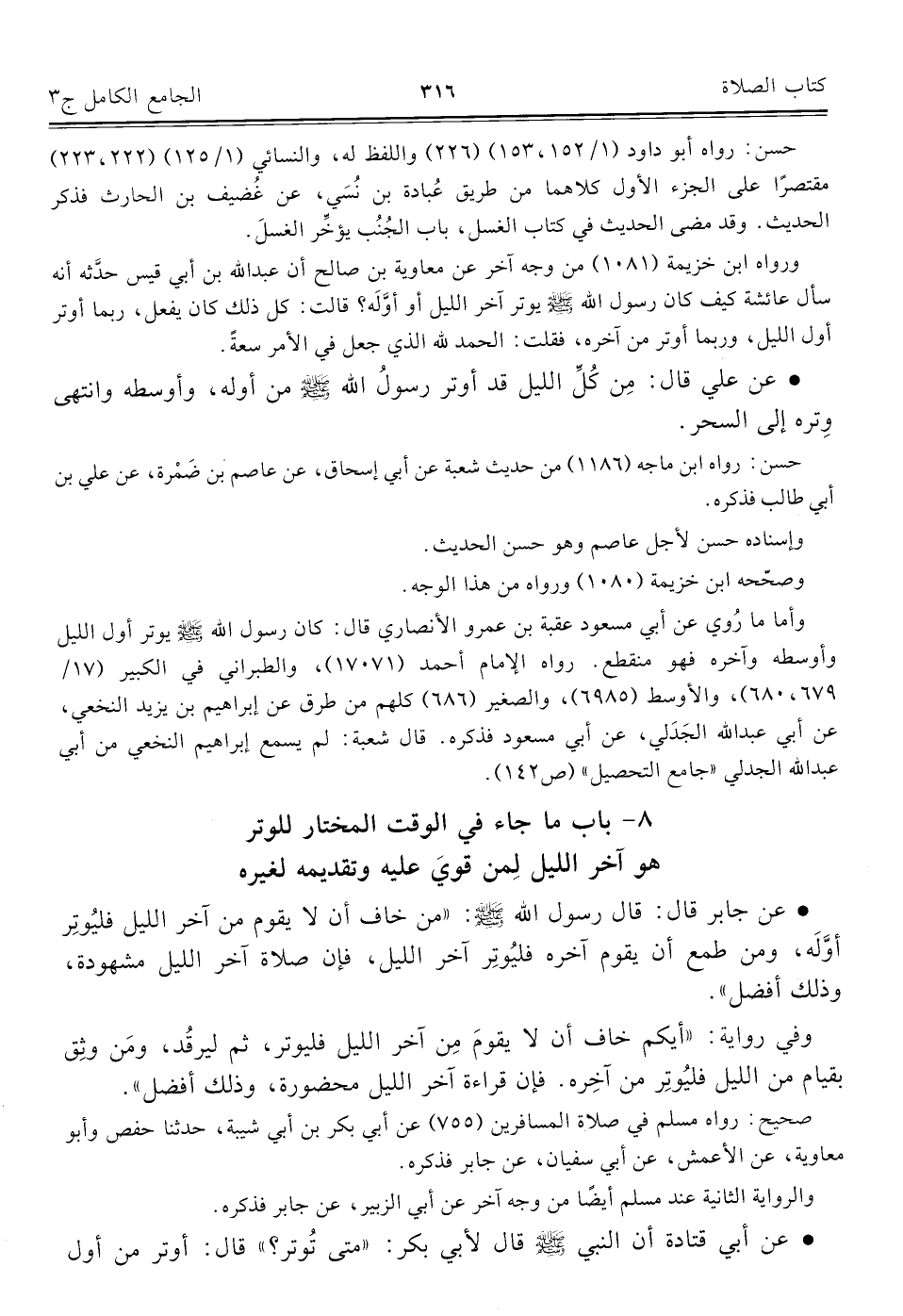 ٨ - باب ما جاء في الوقت المختار للوتر هو آخر الليل لِمن قويَ عليه وتقديمه لغيره