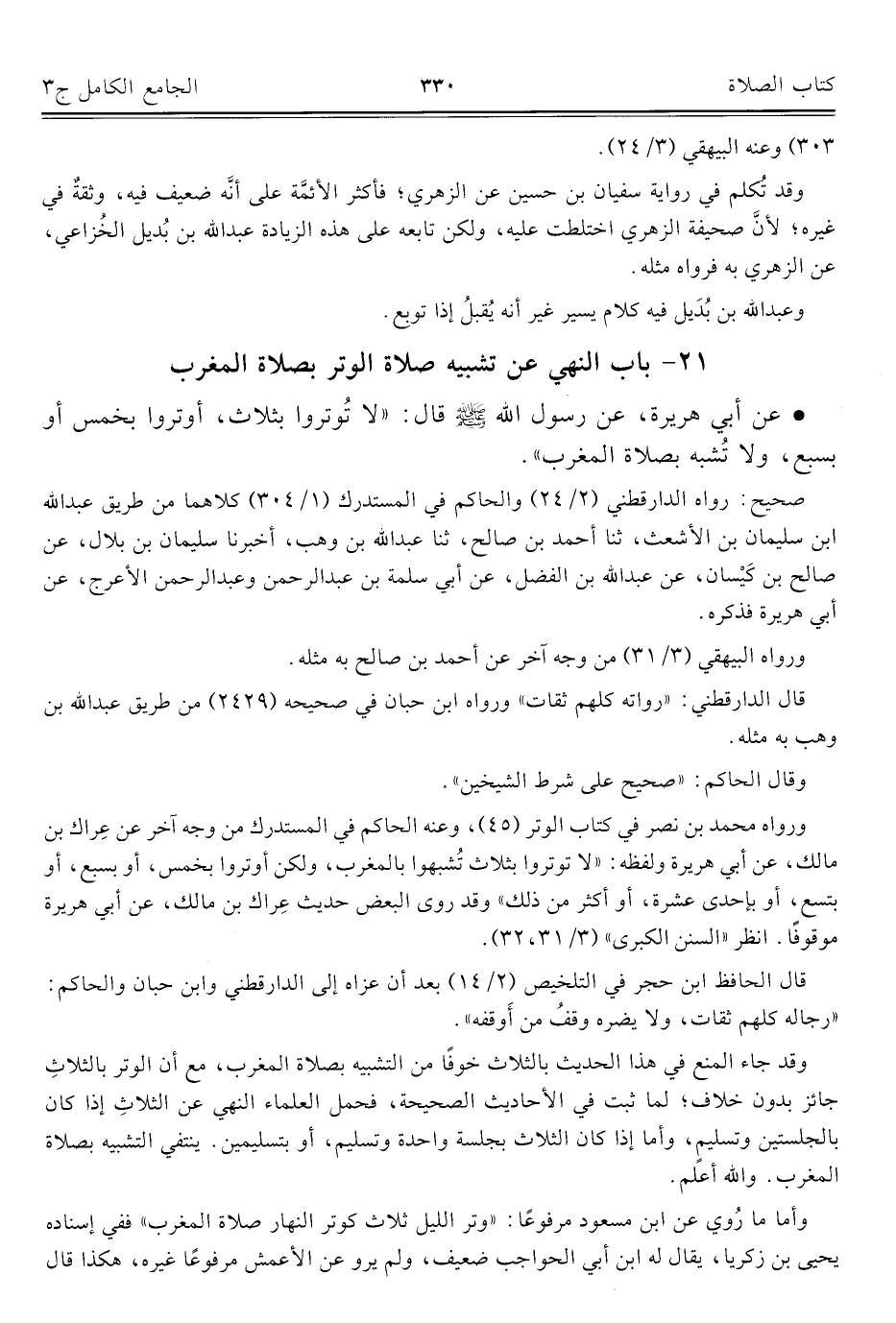 ورواه محمد بن نصر في كتاب الوتر (٤٥)، وعنه الحاكم في المستدرك من وجه آخر عن عِراك بن مالك، عن أبي هريرة ولفظه: "لا توتروا بثلاث تُشبهوا بالمغرب، ولكن أوتروا بخمس، أو بسبع، أو بتسع، أو بإحدى عشرة، أو أكثر من ذلك" وقد روى البعض حديث عِراك بن مالك، عن أبي هريرة موقوفًا. انظر "السنن الكبرى" (٣/ ٣١، ٣٢).