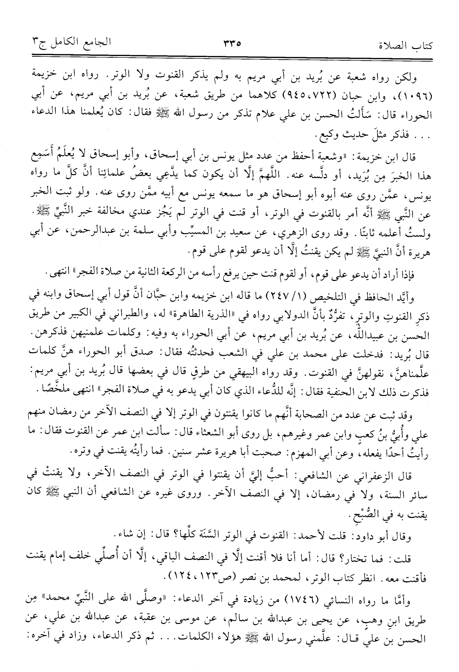 وأيَّد الحافظ في التلخيص (١/ ٢٤٧) ما قاله ابن خزيمة وابن حبَّان أنَّ قول أبي إسحاق وابنه في ذكر القنوتِ والوتر، تفرُّدٌ بأنَّ الدولابي رواه في "الذرية الطاهرة" له، والطبراني في الكبير من طريق الحسن بن عبيد الله، عن بُريد بن أبي مريم، عن أبي الحوراء به وفيه: وكلمات علمنيهن فذكرهن. قال بُريد: فدخلت على محمد بن علي في الشعب فحدثتُه فقال: صدق أبو الحوراء هنَّ كلمات علَّمناهنَّ، نقولهنَّ في القنوت. وقد رواه البيهقي من طرقٍ قال في بعضها قال بُريد بن أبي مريم: فذكرت ذلك لابن الحنفية فقال: إنَّه للدُّعاء الذي كان أبي يدعو به في صلاة الفجر" انتهى ملخَّصًا.