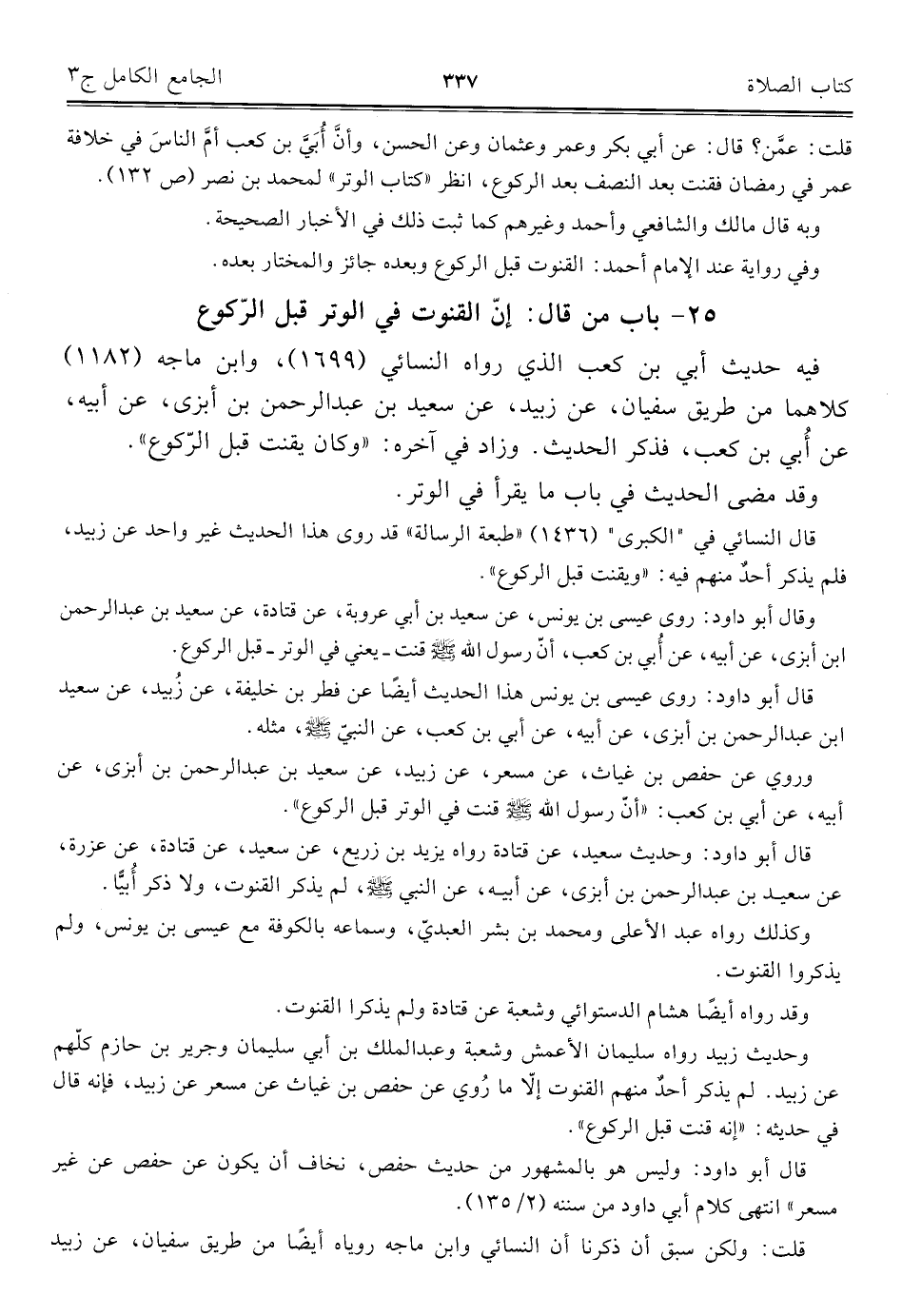 فيه حديث أبي بن كعب الذي رواه النسائي (١٦٩٩)، وابن ماجه (١١٨٢) كلاهما من طريق سفيان، عن زبيد، عن سعيد بن عبد الرحمن بن أبزى، عن أبيه، عن أُبي بن كعب، فذكر الحديث. وزاد في آخره: "وكان يقنت قبل الرّكوع".