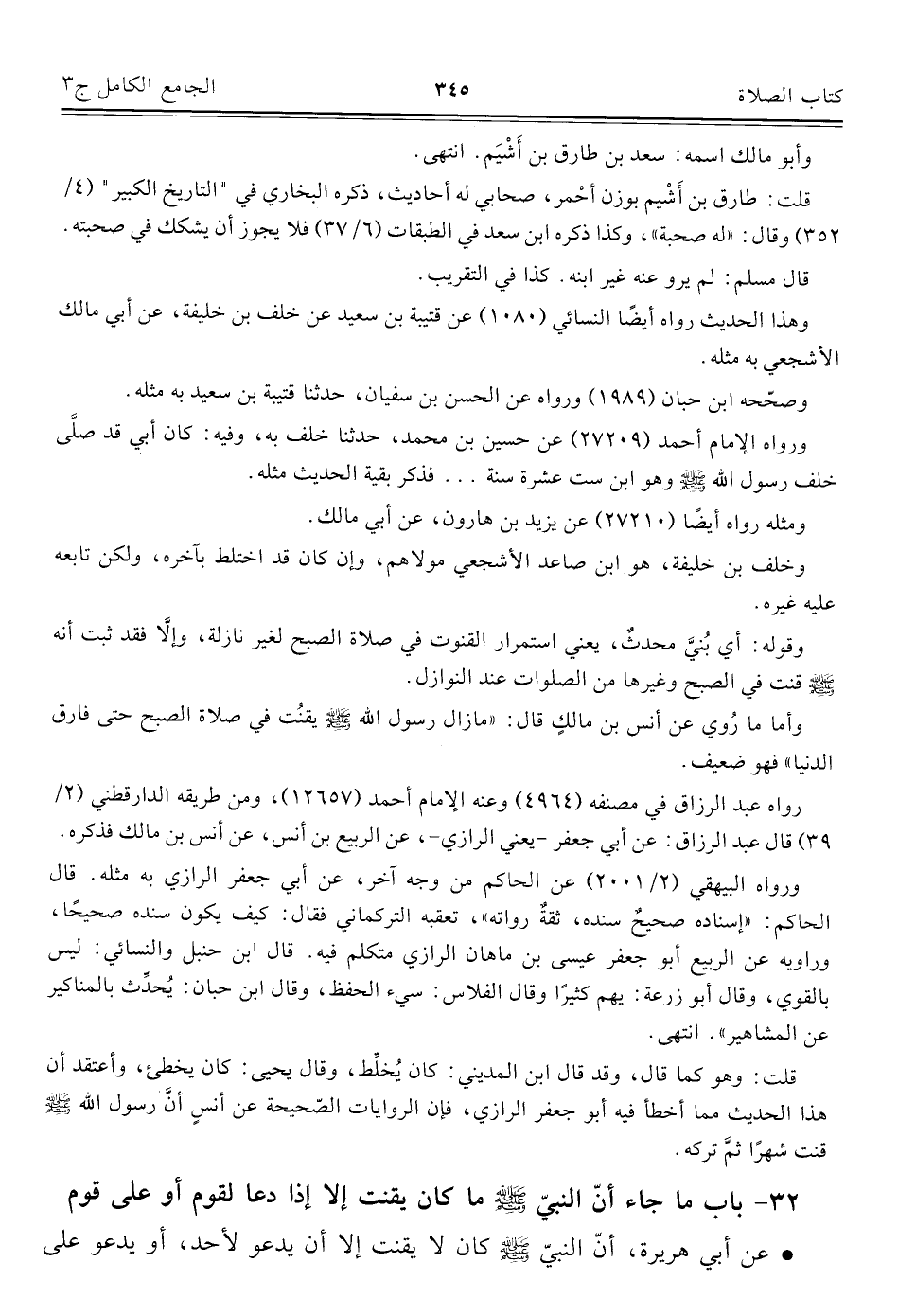 ٣٢ - باب ما جاء أنّ النبيّ - صلى الله عليه وسلم - ما كان يقنت إلا إذا دعا لقوم أو على قوم