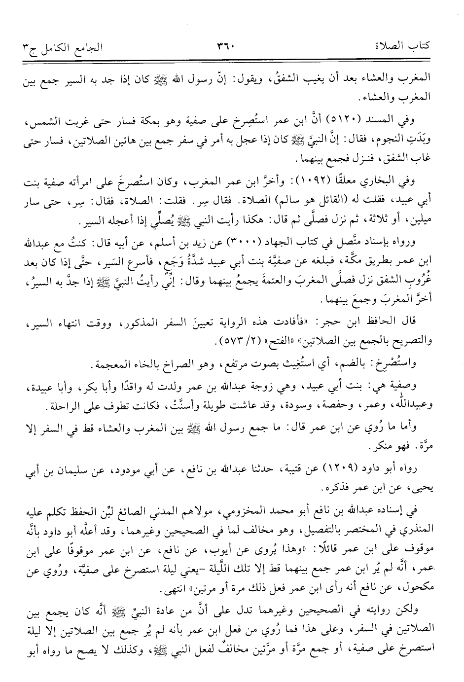 ولكن روايته في الصحيحين وغيرهما تدل على أنَّ من عادة النبيِّ - صلى الله عليه وسلم - أنَّه كان يجمع بين الصلاتين في السفر، وعلى هذا فما رُوي من فعل ابن عمر بأنه لم ير جمع بين الصلاتين إلا ليلة استصرخ على صفية، أو جمع مرَّة أو مرَّتين مخالفٌ لفعل النبي - صلى الله عليه وسلم -، وكذلك لا يصح ما رواه أبو