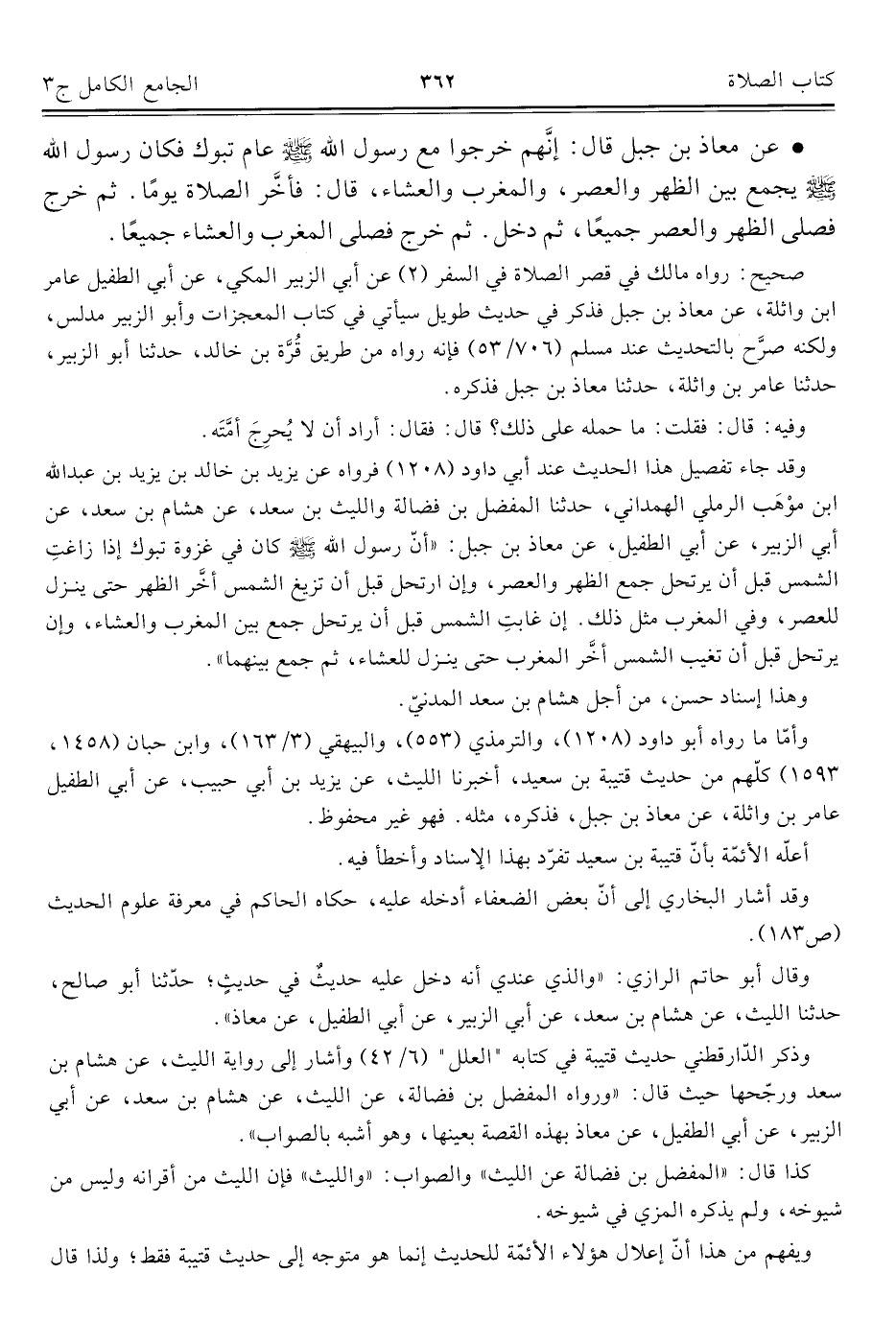 وقد جاء تفصيل هذا الحديث عند أبي داود (١٢٠٨) فرواه عن يزيد بن خالد بن يزيد بن عبد الله بن موْهَب الرملي الهمداني، حدّثنا المفضل بن فضالة والليث بن سعد، عن هشام بن سعد، عن أبي الزبير، عن أبي الطفيل، عن معاذ بن جبل: "أنّ رسول الله - صلى الله عليه وسلم - كان في غزوة تبوك إذا زاغتِ الشمس قبل أن يرتحل جمع الظهر والعصر، وإن ارتحل قبل أن تزيغ الشمس أخَّر الظهر حتى ينزل للعصر، وفي المغرب مثل ذلك. إن غابت الشمس قبل أن يرتحل جمع بين المغرب والعشاء، وإن يرتحل قبل أن تغيب الشمس أخَّر المغرب حتى ينزل للعشاء، ثم جمع بينهما".
