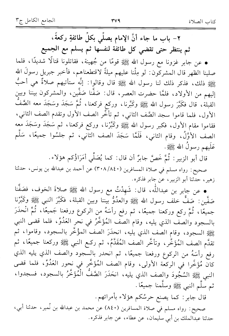• عن جابر بن عبد الله، قال: شَهِدْتُ مع رسول الله - صلى الله عليه وسلم - صلاةَ الخوف، فصَفَّنا صَفَّين: صَفٌّ خلف رسول الله - صلى الله عليه وسلم - والعدُوُّ بيننا وبين القبلة، فكَبَّرَ النبي - صلى الله عليه وسلم - وكَبَّرْنا جميعًا، ثُمَّ ركع وركعنا جميعًا، ثم رفع رأسَهُ من الركوع ورفعنا جَميعًا، ثُمَّ انْحدَرَ بالسجود والصف الذي يليه، وقام الصف المُؤَخَّرُ في نحر العَدُوِّ، فلما قضى النبي - صلى الله عليه وسلم - السجود، وقام الصف الذي يليه، انحدَرَ الصف المؤُخَّر بالسجود، وقاموا، ثم تقدَّم الصف المُؤَخَّر، وتأخَّر الصف المُقَدَّمُ، ثم ركع النبي - صلى الله عليه وسلم - وركعنا جميعًا، ثم رفع رأسَهُ من الركوع ورفعنا جميعًا، ثم انحدر بالسجود والصف الذي يليه الذي كان مُؤَخَّرا في الركعة الأولى، وقام الصف المُؤَخَّر في نحور العَدُوِّ، فلما قضى النبي صلى الله عليه وسلم السُجُودَ والصف الذي يليه، انحَدَرَ الصَّفُّ الْمُؤَخَّرُ بالسجود، فسجدوا، ثم سلَّم النبي - صلى الله عليه وسلم - وسلَّمنا جميعًا.