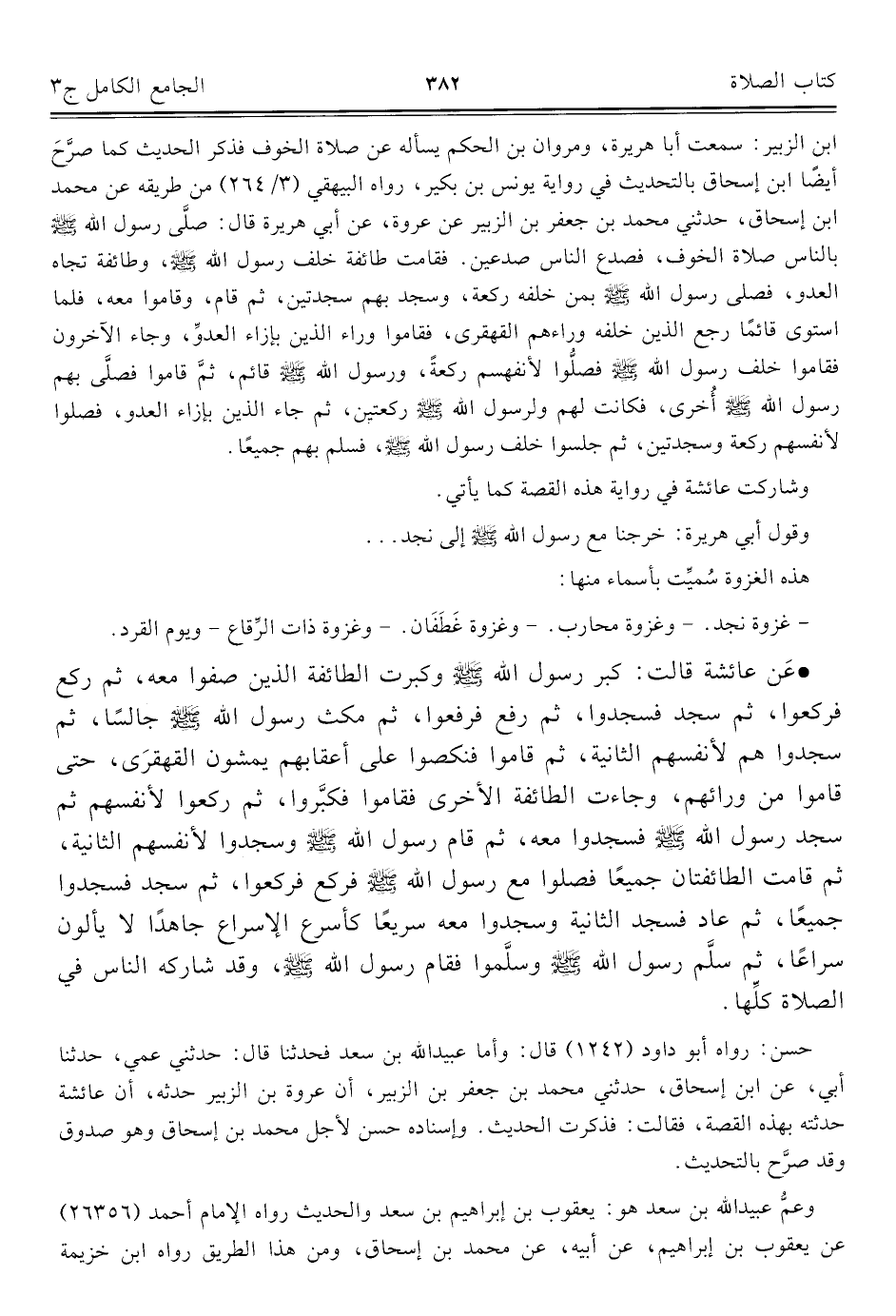 ابن الزبير: سمعت أبا هريرة، ومروان بن الحكم يسأله عن صلاة الخوف فذكر الحديث كما صرَّحَ أيضًا ابن إسحاق بالتحديث في رواية يونس بن بكير، رواه البيهقي (٣/ ٢٦٤) من طريقه عن محمد ابن إسحاق، حدثني محمد بن جعفر بن الزبير عن عروة، عن أبي هريرة قال: صلَّى رسول الله - صلى الله عليه وسلم - بالناس صلاة الخوف، فصدع الناس صدعين. فقامت طائفة خلف رسول الله - صلى الله عليه وسلم -، وطائفة تجاه العدو، فصلى رسول الله صلى الله عليه وسلم بمن خلفه ركعة، وسجد بهم سجدتين، ثم قام، وقاموا معه، فلما استوى قائمًا رجع الذين خلفه وراءهم القهقرى، فقاموا وراء الذين بإزاء العدوِّ، وجاء الآخرون فقاموا خلف رسول الله صلى الله عليه وسلم فصلُّوا لأنفسهم ركعةً، ورسول الله - صلى الله عليه وسلم - قائم، ثمَّ قاموا فصلَّي بهم رسول الله - صلى الله عليه وسلم - أُخرى، فكانت لهم ولرسول الله - صلى الله عليه وسلم - ركعتين، ثم جاء الذين بإزاء العدو، فصلوا لأنفسهم ركعة وسجدتين، ثم جلسوا خلف رسول الله - صلى الله عليه وسلم -، فسلم بهم جميعًا.