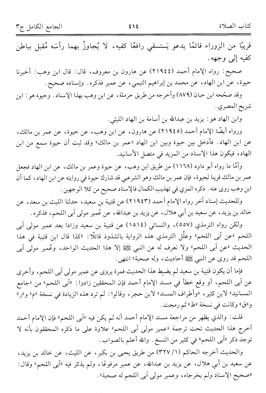 وأمَّا ما رواه أبو داود (١١٦٨) من طريق ابن وهب، عن حيوة وعمر بن مالك، عن ابن الهاد فجعل عمر بن مالك قرينا لحيوة، فإن عمر بن مالك وهو الشرعبي قد شارك حيوة في روايته عن ابن الهاد، كما أن ابن وهب روى عنه. ذكره المزي في تهذيب الكمال فالإسناد صحيح من كلا الوجهين.