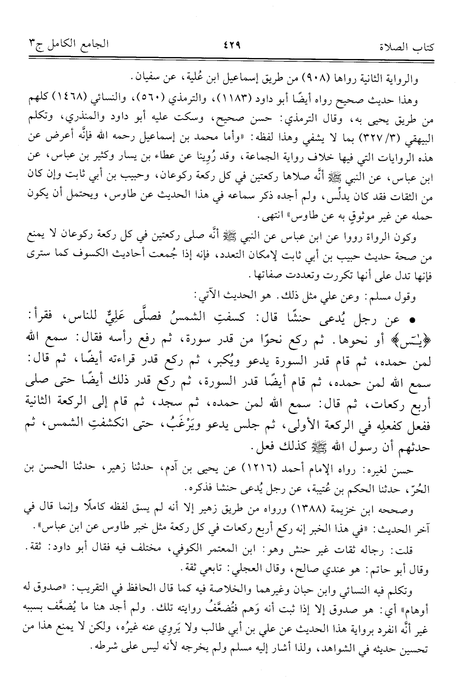 وهذا حديث صحيح رواه أيضًا أبو داود (١١٨٣)، والترمذي (٥٦٠)، والنسائي (١٤٦٨) كلهم من طريق يحيي به، وقال الترمذي: حسن صحيح، وسكت عليه أبو داود والمنذري، وتكلم البيهقي (٣/ ٣٢٧) بما لا يشفي وهذا لفظه: "وأما محمد بن إسماعيل رحمه الله فإنَّه أعرض عن هذه الروايات التي فيها خلاف رواية الجماعة، وقد رُوِينا عن عطاء بن يسار وكثير بن عباس، عن ابن عباس، عن النبي - صلى الله عليه وسلم - أنَّه صلاها ركعتين في كل ركعة ركوعان، وحبيب بن أبي ثابت وإن كان من الثقات فقد كان يدلِّس، ولم أجده ذكر سماعه في هذا الحديث عن طاوس، ويحتمل أن يكون حمله عن غير موثوقٍ به عن طاوس" انتهى.