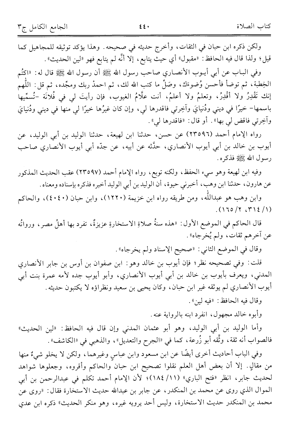 وفي الباب أحاديث أخرى أيضًا عن ابن مسعود وابن عباسٍ وغيرهما، ولكن لا يخلو شيءٌ منها من مقالٍ. إلا أن بعض أهل العلم نقلوا تصحيح ابن حبان والحاكم وأقروه، وجعلوها شواهد لحديث جابر، انظر "فتح الباري" (١١/ ١٨٤)؛ لأن الإمام أحمد تكلم في عبد الرحمن بن أبي الموال الذي روى عن محمد بن المنكدر، عن جابر بن عبد الله حديث الاستخارة فقال: "روي عن محمد بن المنكدر حديث الاستخارة، وليس أحد يرويه غيره، وهو منكر الحديث" ذكره ابن عدي