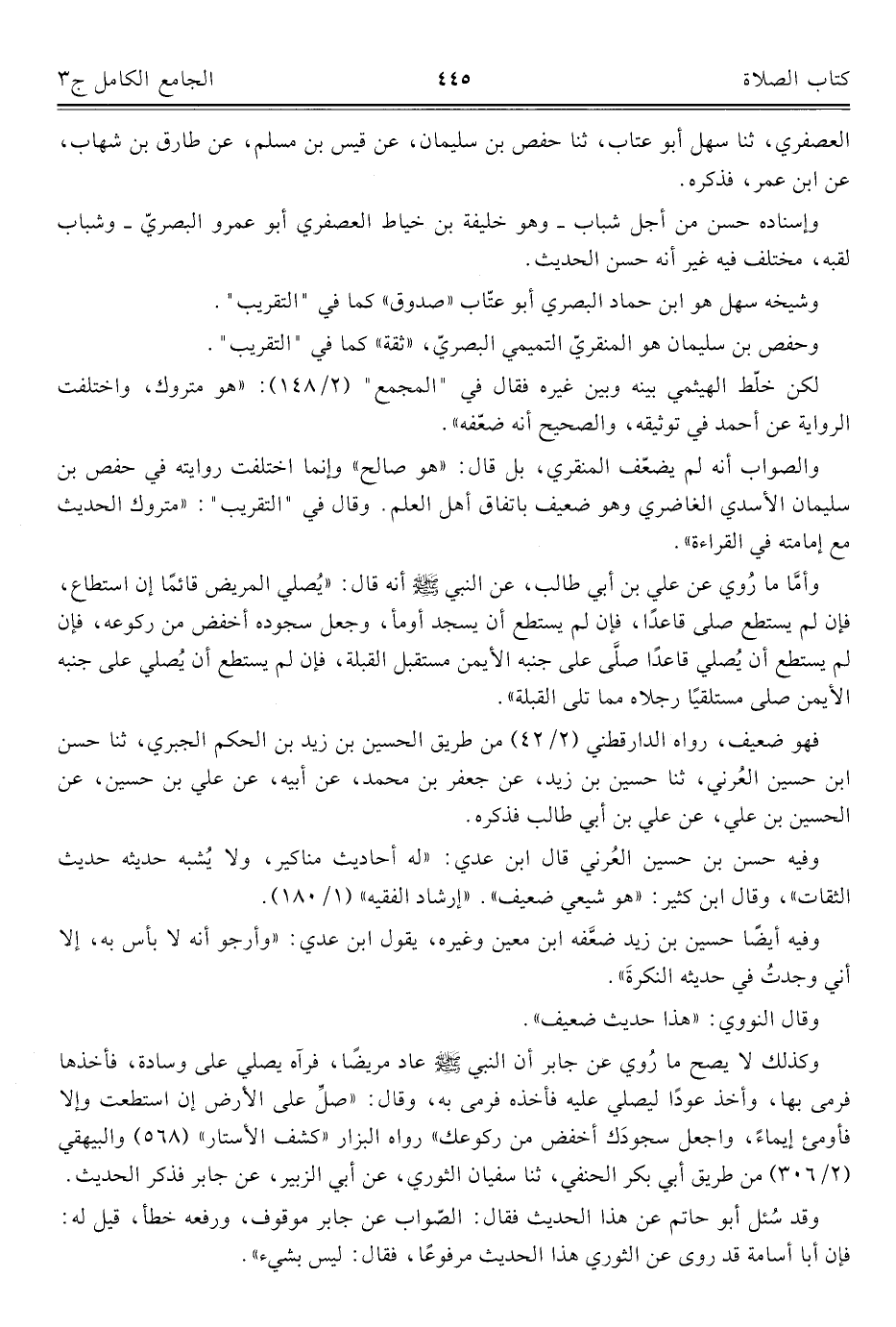 وكذلك لا يصح ما رُوي عن جابر أن النبي - صلى الله عليه وسلم - عاد مريضًا، فرآه يصلي على وسادة، فأخذها فرمي بها، وأخذ عودًا ليصلي عليه فأخذه فرمي به، وقال: "صلِّ على الأرض إن استطعت وإلا فأومئ إيماءً، واجعل سجودَك أخفض من ركوعك" رواه البزار "كشف الأستار" (٥٦٨) والبيهقي (٢/ ٣٠٦) من طريق أبي بكر الحنفي، ثنا سفيان الثوري، عن أبي الزبير، عن جابر فذكر الحديث.