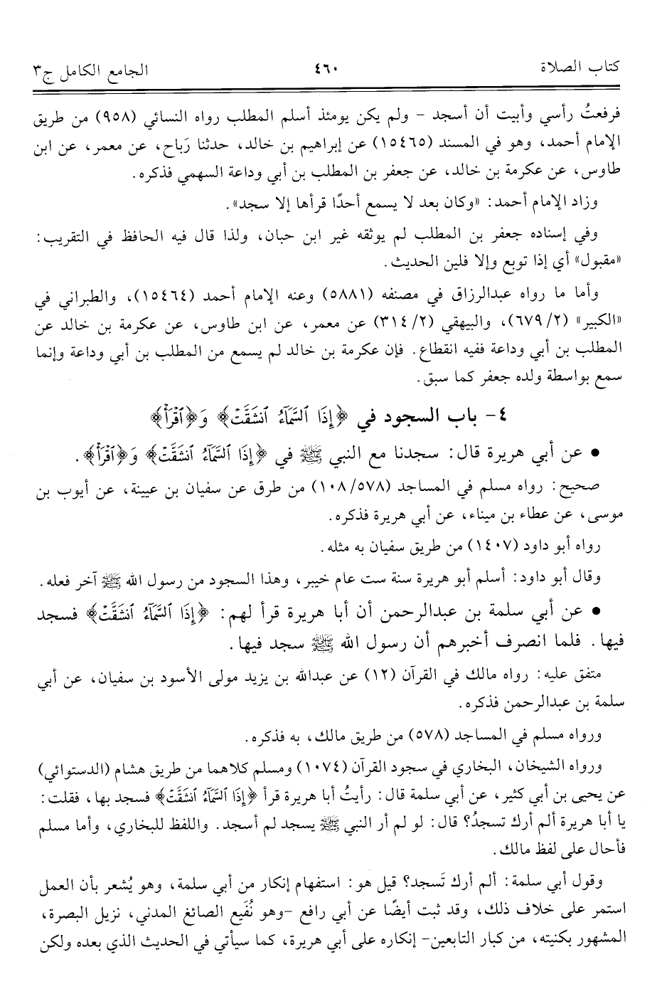 • عن أبي هريرة قال: سجدنا مع النبي - صلى الله عليه وسلم - في {إِذَا السَّمَاءُ انْشَقَّتْ} و {اقْرَأْ}.