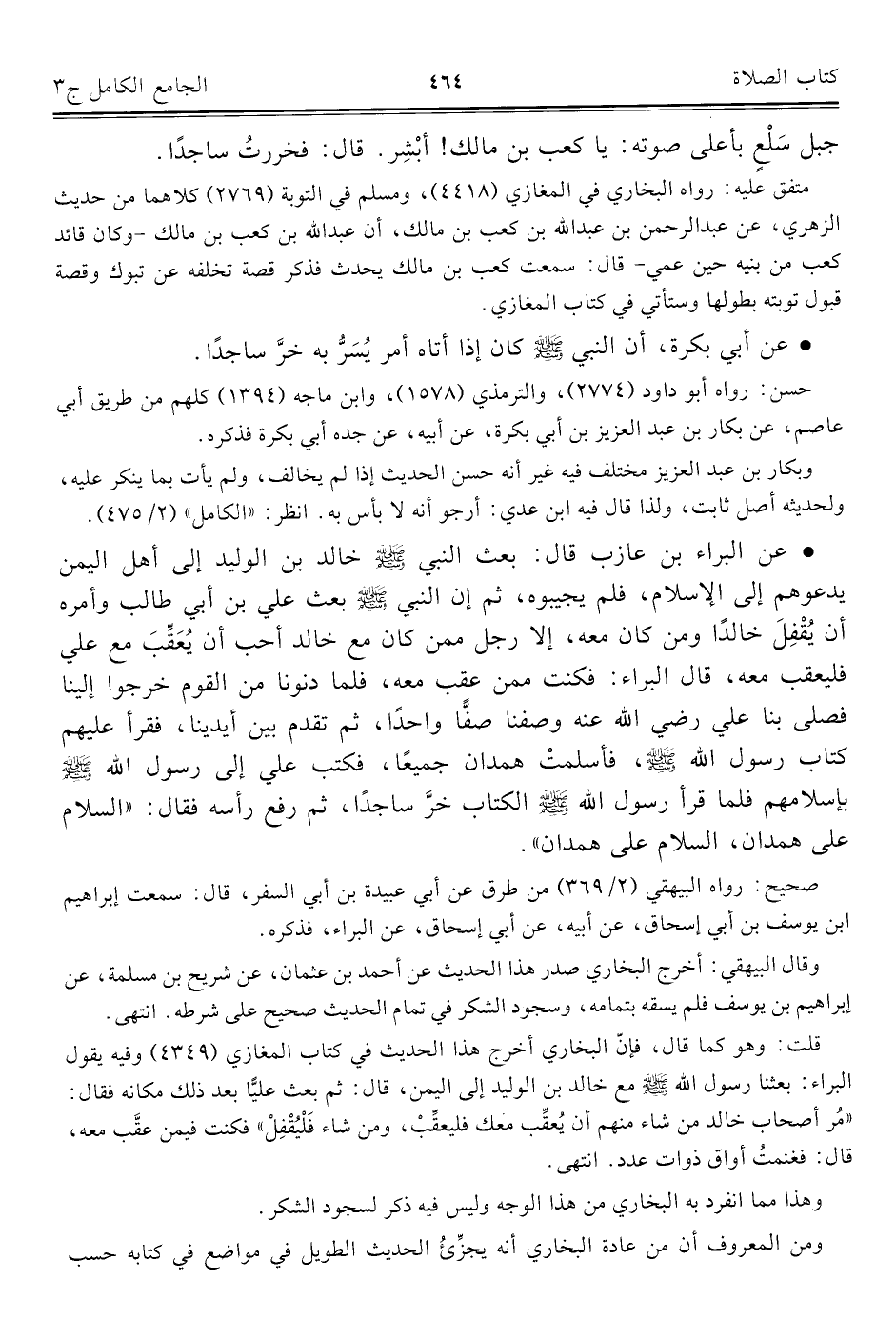 وقال البيهقي: أخرج البخاري صدر هذا الحديث عن أحمد بن عثمان، عن شريح بن مسلمة، عن إبراهيم بن يوسف فلم يسقه بتمامه، وسجود الشكر في تمام الحديث صحيح على شرطه. انتهى.