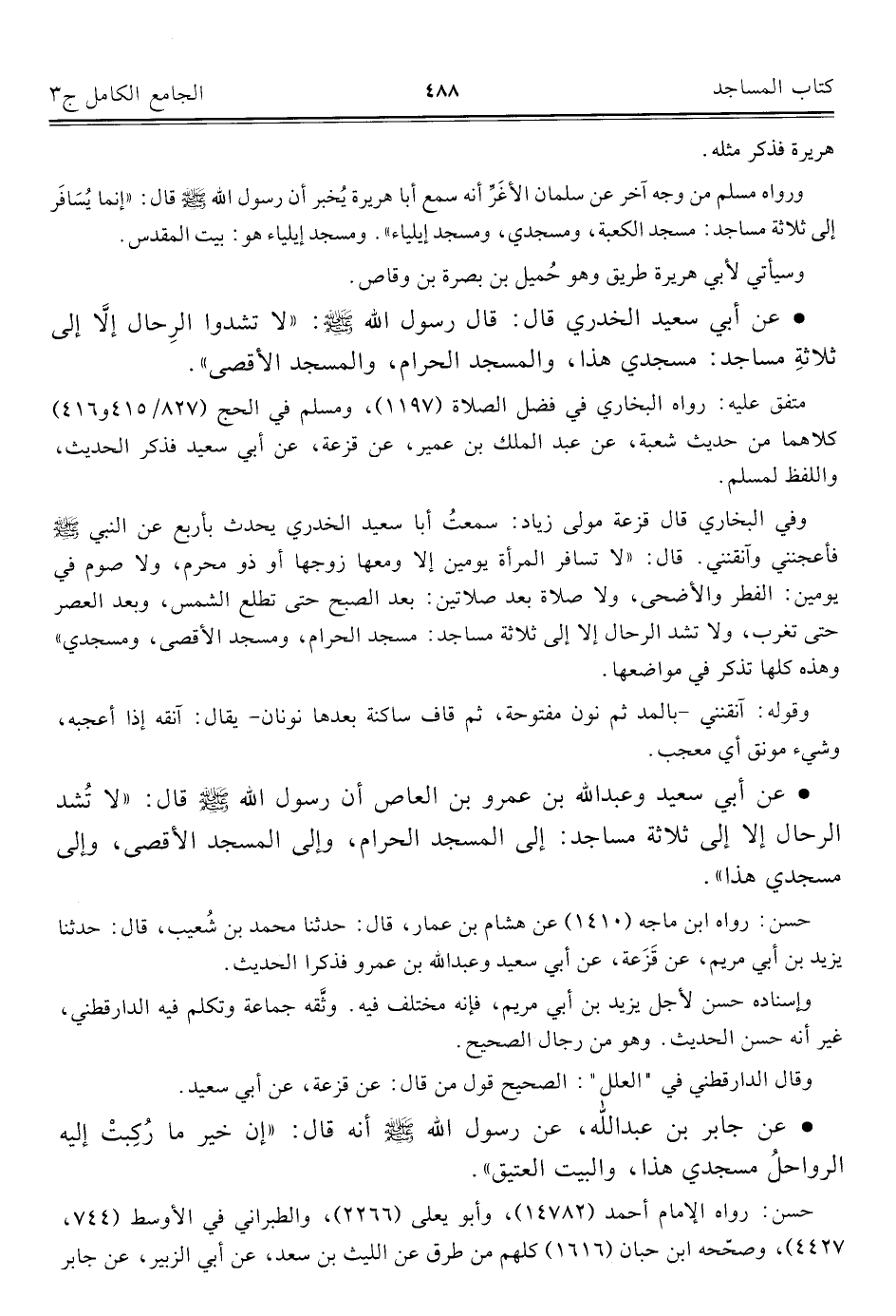 • عن أبي سعيد وعبد الله بن عمرو بن العاص أن رسول الله - صلى الله عليه وسلم - قال: "لا تُشد الرحال إلا إلى ثلاثة مساجد: إلى المسجد الحرام، وإلى المسجد الأقصى، وإلى مسجدي هذا".
