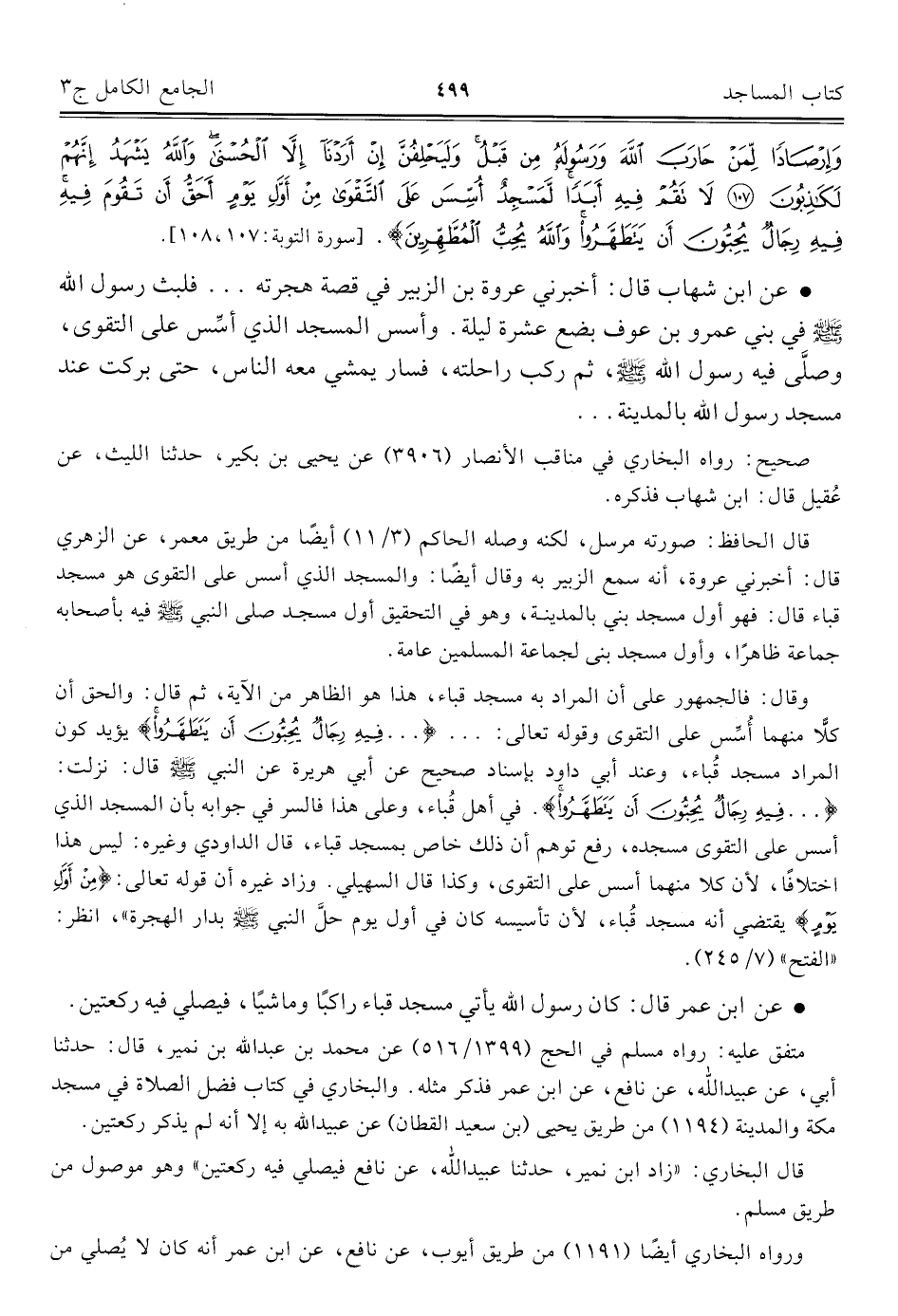 قال الحافظ: صورته مرسل، لكنه وصله الحاكم (٣/ ١١) أيضًا من طريق معمر، عن الزهري قال: أخبرني عروة، أنه سمع الزبير به وقال أيضًا: والمسجد الذي أسس على التقوى هو مسجد قُباء قال: فهو أول مسجد بني بالمدينة، وهو في التحقيق أول مسجد صلى النبي صلى الله عليه وسلم فيه بأصحابه جماعة ظاهرًا، وأول مسجد بني لجماعة المسلمين عامة.