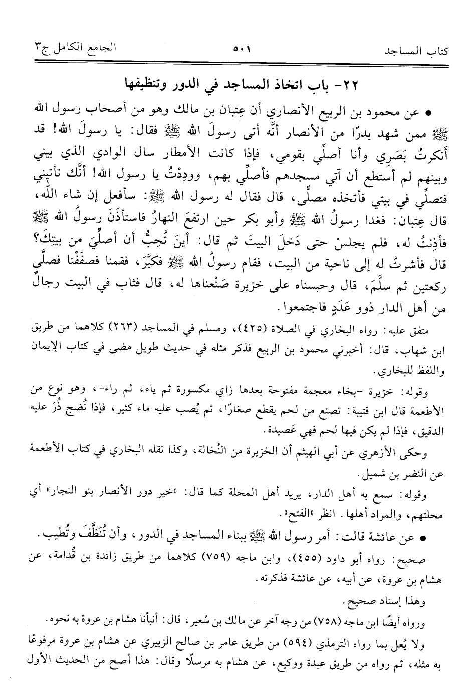 • عن محمود بن الربيع الأنصاري أن عتبان بن مالك وهو من أصحاب رسول الله - صلى الله عليه وسلم - ممن شهد بدرًا من الأنصار أنه أتى رسولَ الله صلى الله عليه وسلم فقال: يا رسولَ الله! قد أَنكرتُ بَصَرِي وأنا أصلِّي بقومي، فإذا كانت الأمطار سال الوادي الذي بيني وبينهم لم أستطع أن آتي مسجدهم فأصلِّي بهم، وودِدْتُ يا رسول الله! أنَّك تأتيني فتصلِّي في بيتي فأتخذه مصلًّى، قال فقال له رسول الله - صلى الله عليه وسلم -: سأفعل إن شاء الله، قال عِتبان: فغدا رسولُ الله صلى الله عليه وسلم وأبو بكر حين ارتفعَ النهارُ فاستأذَنَ رسولُ الله صلى الله عليه وسلم فأذِنتُ له، فلم يجلسْ حتى دَخلَ البيتَ ثم قال: أينَ تُحِبُّ أن أصلِّيَ من بيتِكَ؟ قال فأشرتُ له إلى ناحية من البيت، فقام رسولُ الله - صلى الله عليه وسلم - فكبَّرَ، فقمنا فصفَفْنا فصلَّى ركعتين ثم سلَّمَ، قال وحبسناه على خزيرة صَنْعناها له، قال فثاب في البيت رجالٌ من أهل الدار ذوو عَدَدٍ فاجتمعوا.