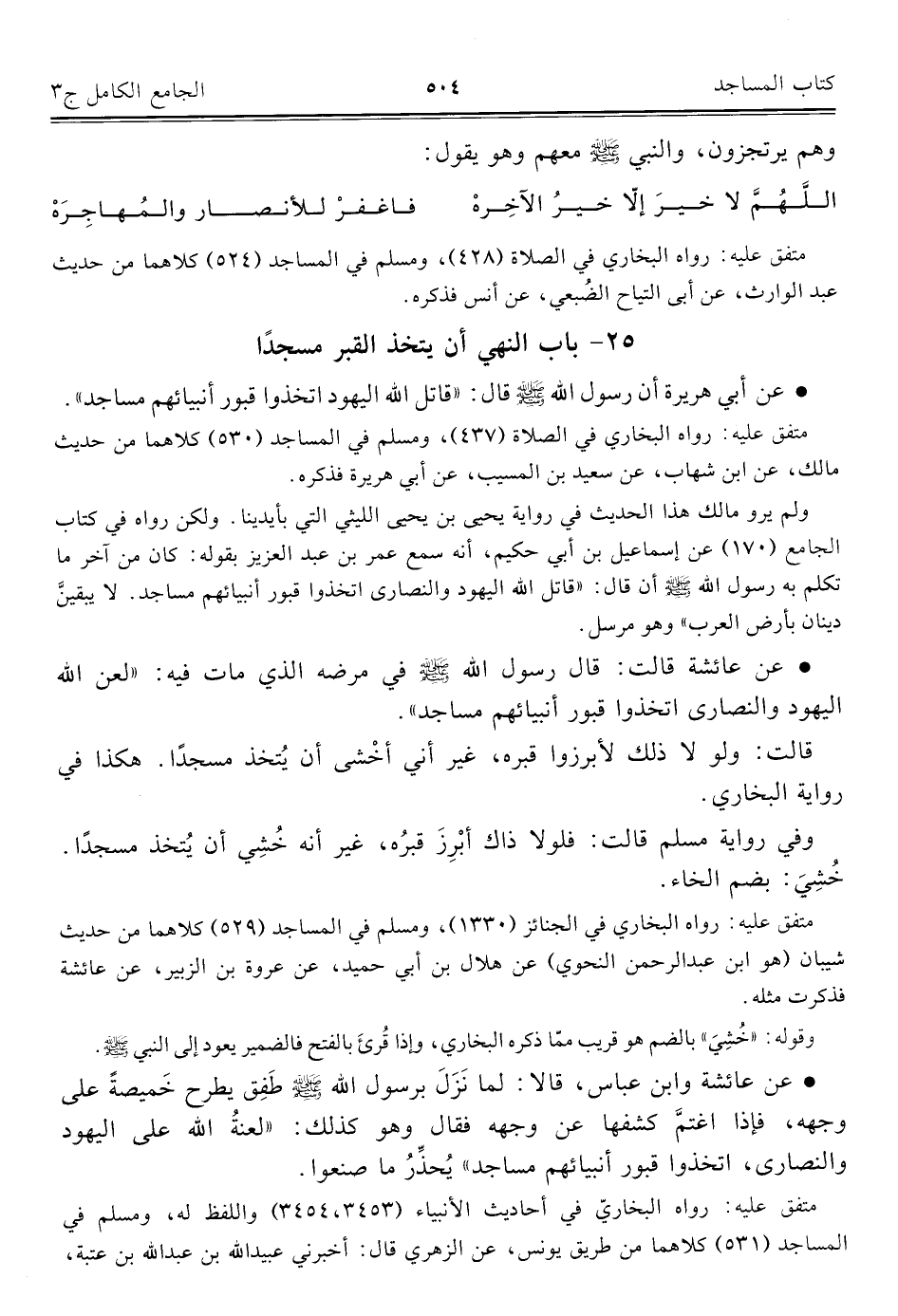 • عن عائشة قالت: قال رسول الله - صلى الله عليه وسلم - في مرضه الذي مات فيه: "لعن الله اليهود والنصارى اتخذوا قبور أنبيائهم مساجد".